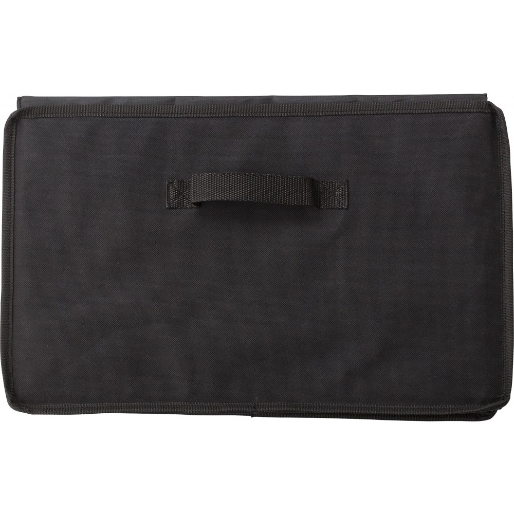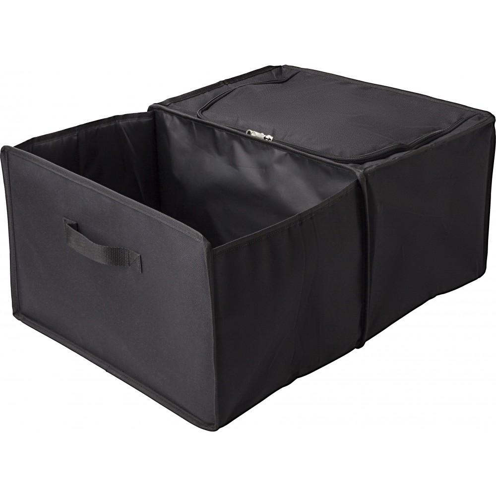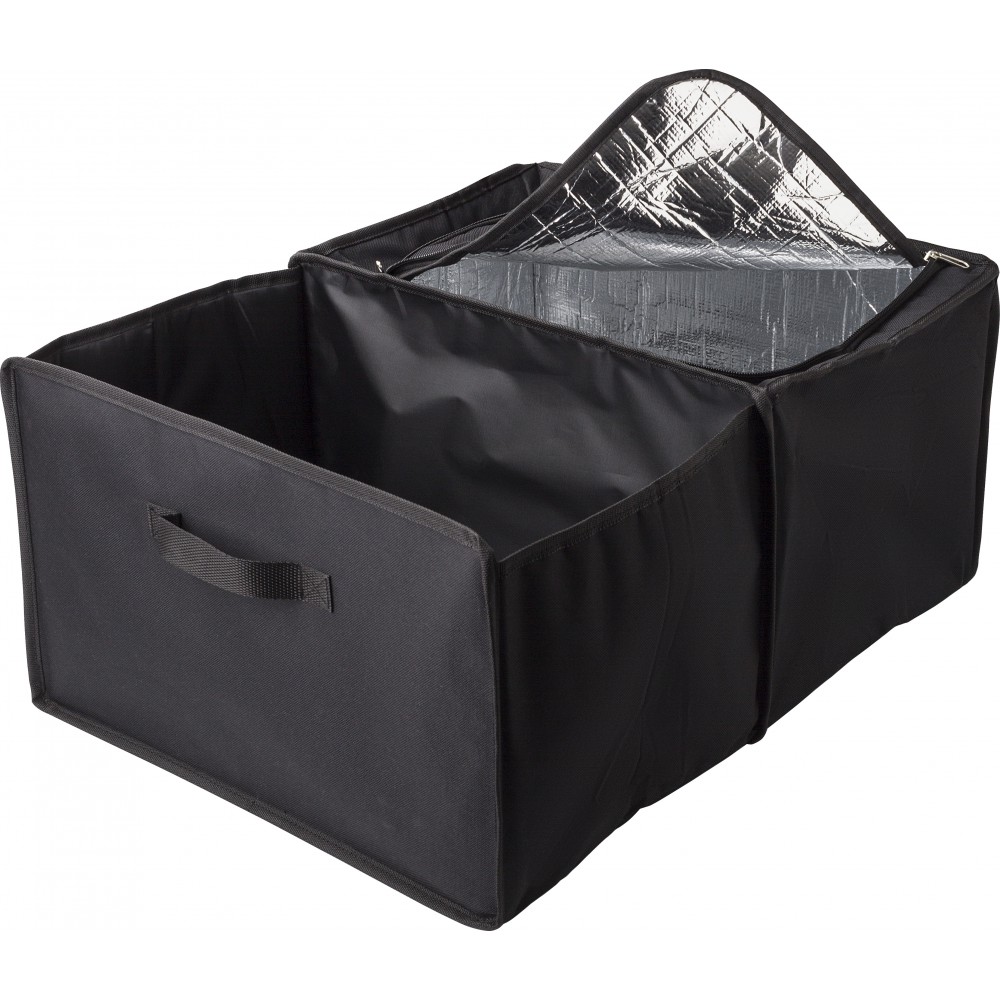 Autós rendező. Két rekesz, amelyből az egyik egy cipzárral zárható hűtőtáska alu szigeteléssel. Laposra hajtogatható. 600D poliészter. Emblémázás: Szitanyomás