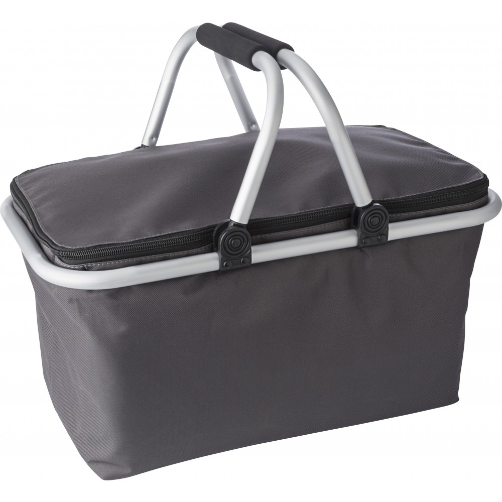 Bevásárlókosár és hűtőtáska. Összecsukható kosár belül fóliával szigetelt anyagból, cipzáros záródással, alumínium vázzal, EVA fogóval, Oxford anyagból. Emblémázás: Szitanyomás