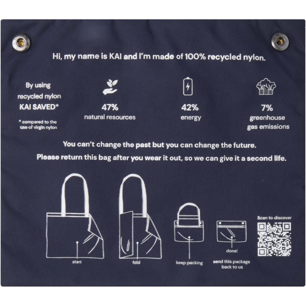 Kai GRS újrahasznosított bevásárlótáska ? a legpozitívabb hatás környezetvédelmi szempontjából. A fenntarthatóság kifejezése a jobb dizájnnal kezdődik ? egy olyan dizájnnal, amely kevesebb hatással van a környezetre. Az egy táskával elért átlagos ártalomcsökkentés a következő: 7% szénlábnyom, 42% energia és 47% ökoköltség. A táska 200T GRS tanúsítvánnyal rendelkező újrahasznosított nejlonból készül, és egy klasszikus és időtálló bevásárlótáska, amely mindennapi használatra alkalmas. Az emblémázásra javasolt pozíció a zseb, amely egyben tok is. Emblémázás: Szitanyomás