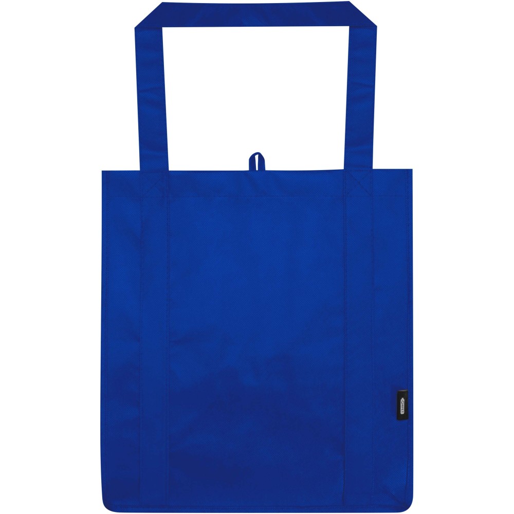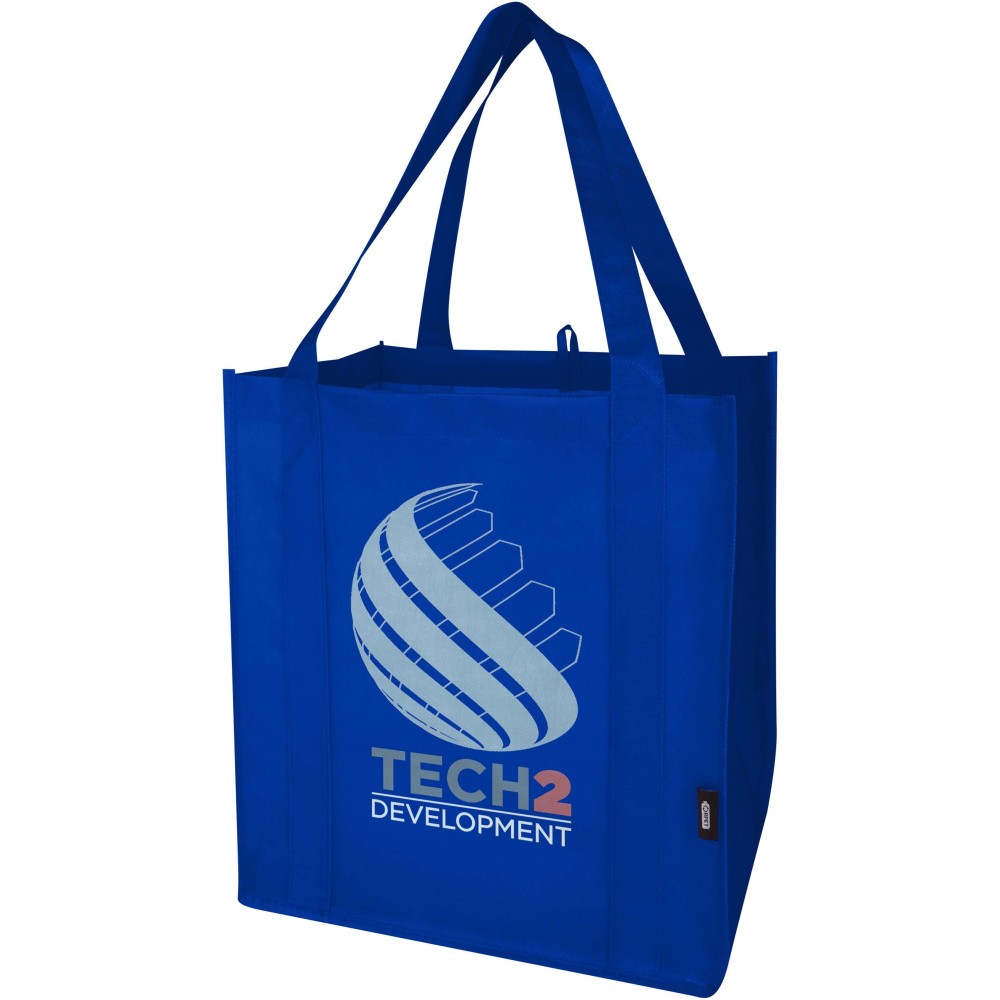 A Liberty GRS tanúsítvánnyal rendelkező újrahasznosított bevásárlótáska tartós és szakadásálló nem szőtt RPET anyagból készült, megerősített aljrésszel, amely extra stabilitást és sokoldalú felhasználást biztosít. A táska nagy méretű főrekesszel és 25 cm hosszú fülekkel rendelkezik, így kényelmesen hordozható. Űrtartalma: 29 liter. Teherbírás: akár 12 kg. Emblémázás: Szitanyomás