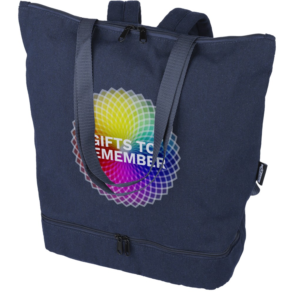 Bevásárlótáska és hátizsák 330 g/m2 újahasznosított policotton anyagból, 210D poliészter béléssel. Egy nagy cipzáras rekesszel a tetején, cipzáras rekesszel az alján, 15"-es laptoptartó résszel, két belső rekesszel és egy külső cipzáras résszel. Hordozófüllel és párnázott, állítható vállpánttal. Űrtartalom: 30 liter, teherbíró képesség: 15 kg. Címkét tartalmaz. Emblémázás: Szitanyomás