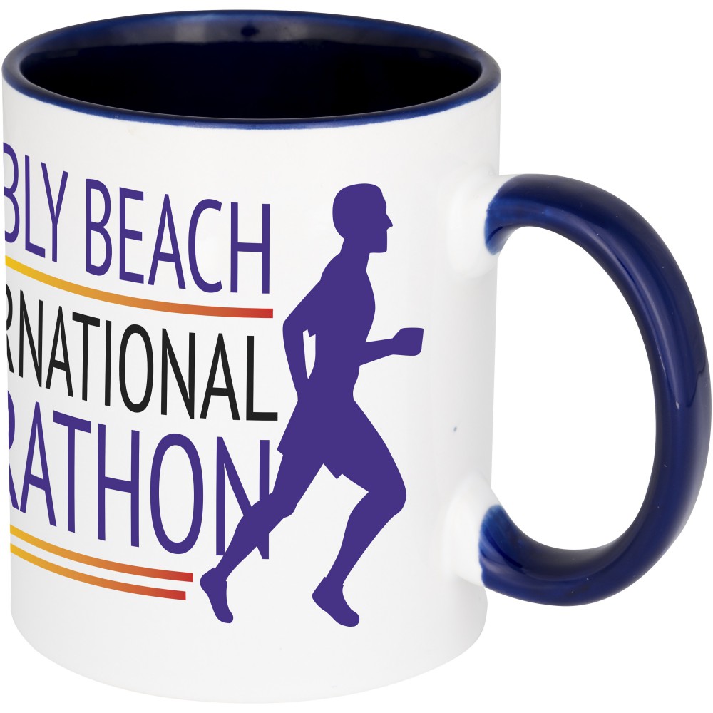 Klasszikus stílusú szublimálható kerámia bögre. Illeszkedő színű belső felülettel és füllel rendelkezik. Nem szivárgásmentes. Szénsavas italokkal is használható. Mosogatógépben mosható és mikrohullámú sütőben történő melegítésre alkalmas. Űrtartalom: 330 ml. Csomagolása fehér kartondoboz. Emblémázás: Szublimálás