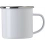 Rozsdamentes acél peremmel ellátott zománcozott bögre. Csomagolása egyenként barna kartondoboz. Űrtartalom: 350 ml. Emblémázás: Bögredekor, Tamponnyomás
