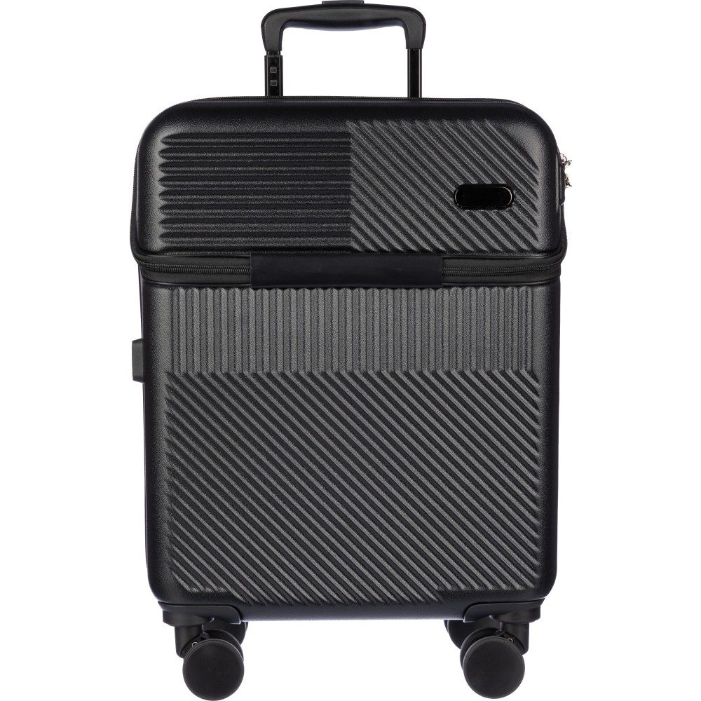 Gurulós bőrönd cipzáras laptop zsebbel, 8 kerékkel és háromszintű fogantyúrendszerrel. Beépített számzár és külön lapocska a lézergravírozáshoz. USB porttal. Emblémázás: Gravírozás