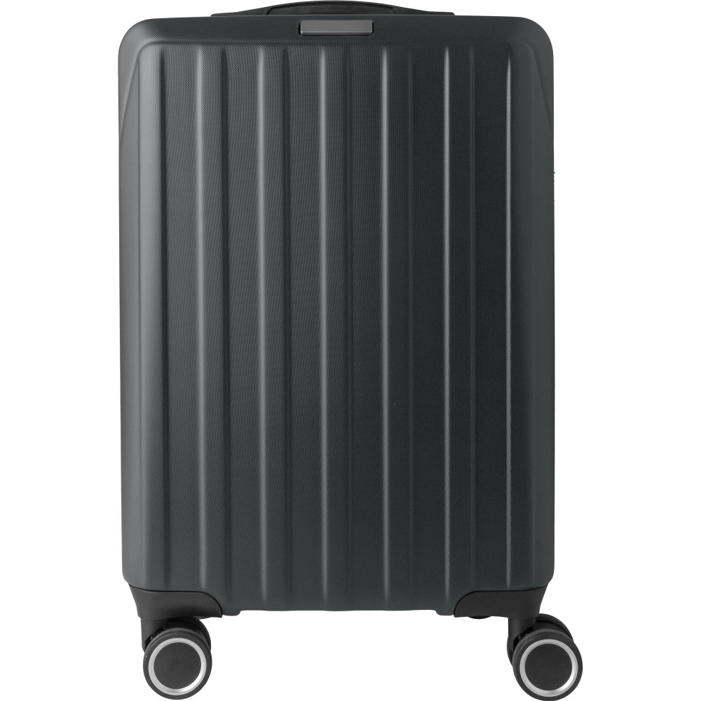 Keményfedeles ABS gurulós bőrönd 8 kerékkel (4x2), és háromszintű fém fogantyúrendszerrel. Felső műanyag fogantyút, számkombinációs zárat és 3M ragasztócsíkkal rögzíthető gravírozható táblát tartalmaz. A belső bélés anyaga 210D, a táskán belül 3 rekesz áll rendelkezésre: U-cipzáras zseb, hálós zseb és X-alakú, csattal záródó gumis heveder. Űrtartalom: 30 liter. Csomagolása barna papírdoboz. Emblémázás: Gravírozás