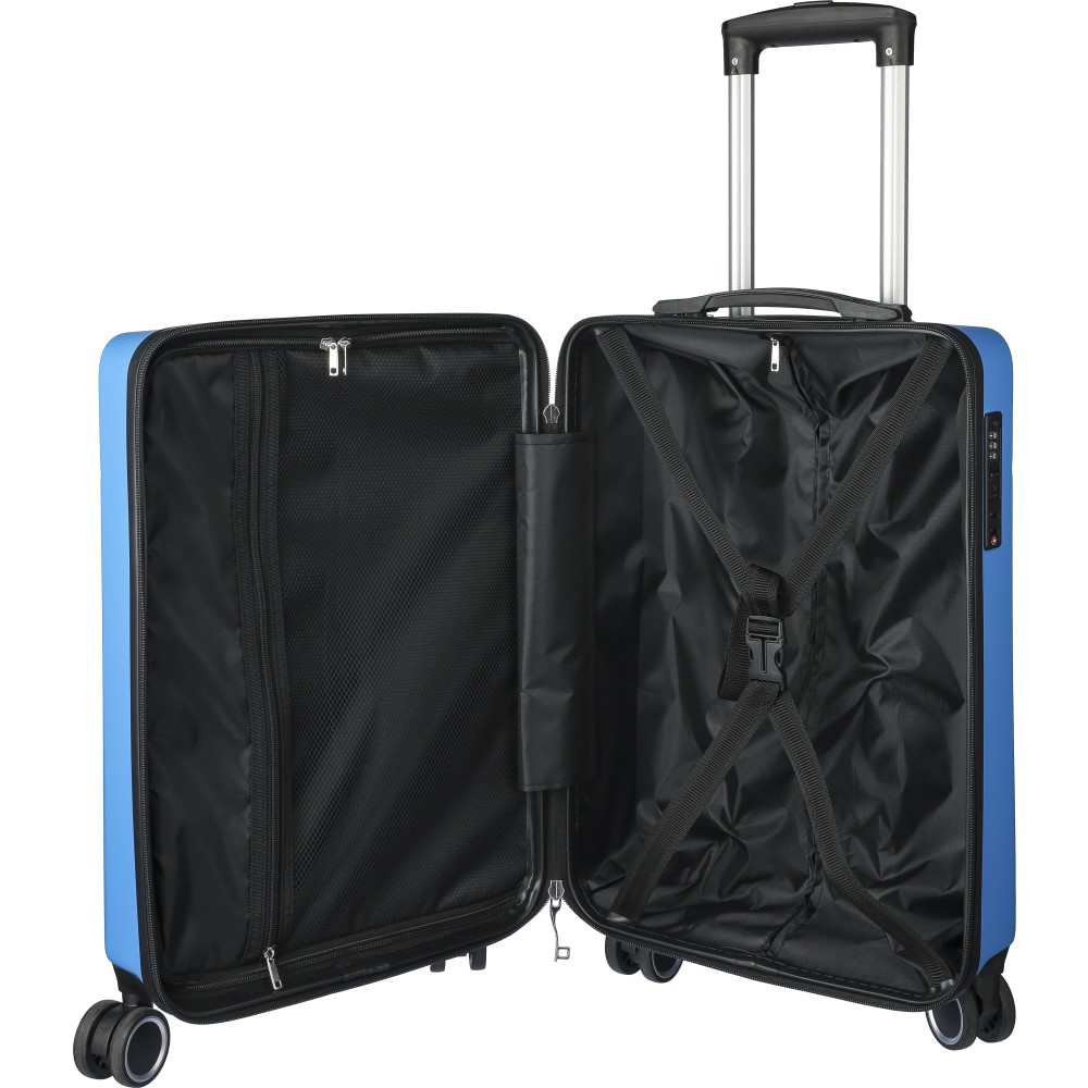 Keményfedeles ABS gurulós bőrönd 8 kerékkel (4x2), és háromszintű fém fogantyúrendszerrel. Felső műanyag fogantyút, számkombinációs zárat és 3M ragasztócsíkkal rögzíthető gravírozható táblát tartalmaz. A belső bélés anyaga 210D, a táskán belül 3 rekesz áll rendelkezésre: U-cipzáras zseb, hálós zseb és X-alakú, csattal záródó gumis heveder. Űrtartalom: 30 liter. Csomagolása barna papírdoboz. Emblémázás: Gravírozás
