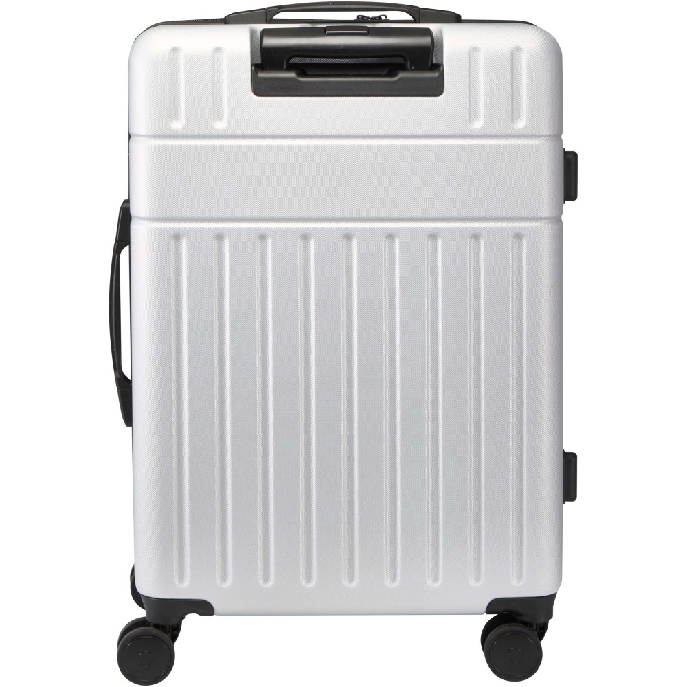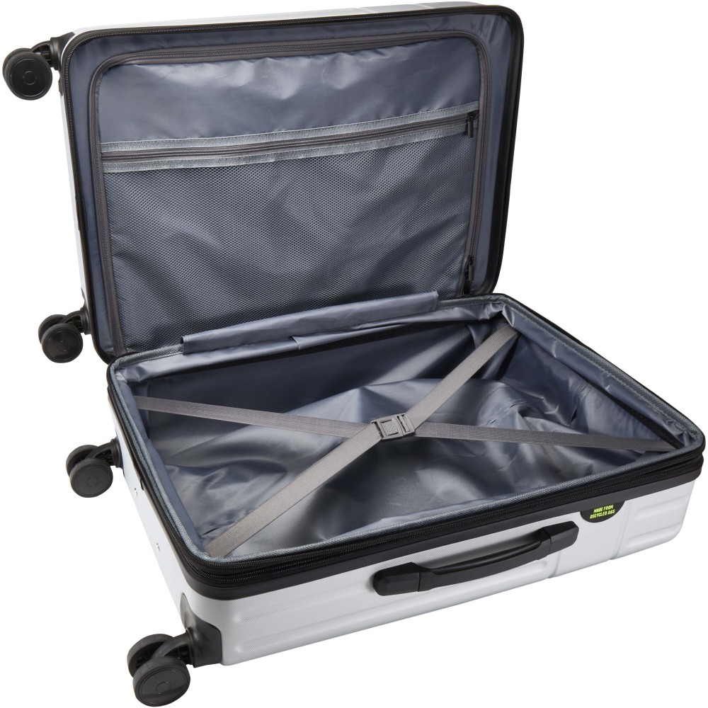 Ütésálló, újrahasznosított műanyagból, RPET béléssel készült a Rover 24" bővíthető gurulós bőrönd, amely a tartósságot és az átgondolt kialakítást kedvelő modern utazóknak készült. Tágas, 70 literes kapacitása bővíthető, így a plusz csomagoknak is jut hely - tökéletes hosszabb utakhoz. A GRS tanúsítvánnyal rendelkező bőrönd dupla csöves alumínium vázzal és 360 fokban forgó, 4 kerekes rendszerrel rendelkezik a könnyű manőverezésért. A beépített TSA számzár extra biztonságot nyújt, míg a kényelmes fogantyú megkönnyíti a szállítást. Belsejében kompressziós pántok és cipzáras rekeszek gondoskodnak a csomagok rendszerezett tárolásáról az egész utazás során. Emblémázás: Gravírozás