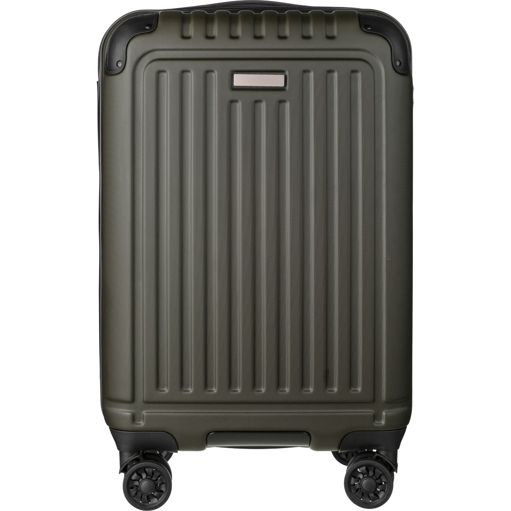 Gurulós bőrönd 8 kerékkel és háromszintű fogantyúrendszerrel. Beépített számzár és külön lapocska a lézergravírozáshoz. USB porttal. Emblémázás: Gravírozás