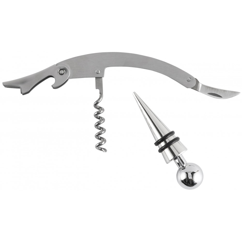 Üvegdugó és pincérbicska díszdobozban. Rozsdamentes acél. Emblémázás: Gravírozás, Tamponnyomás