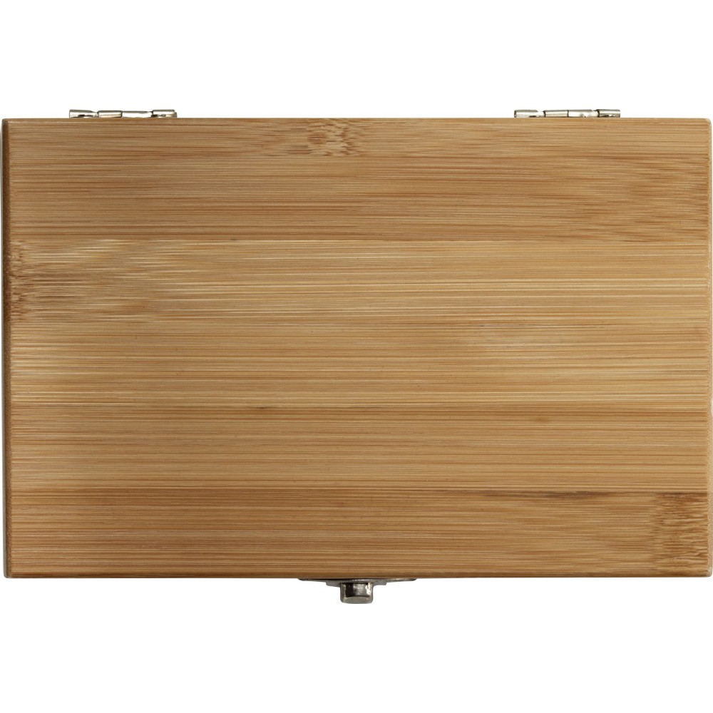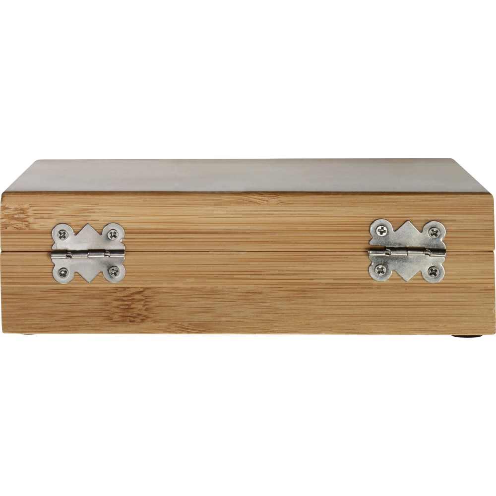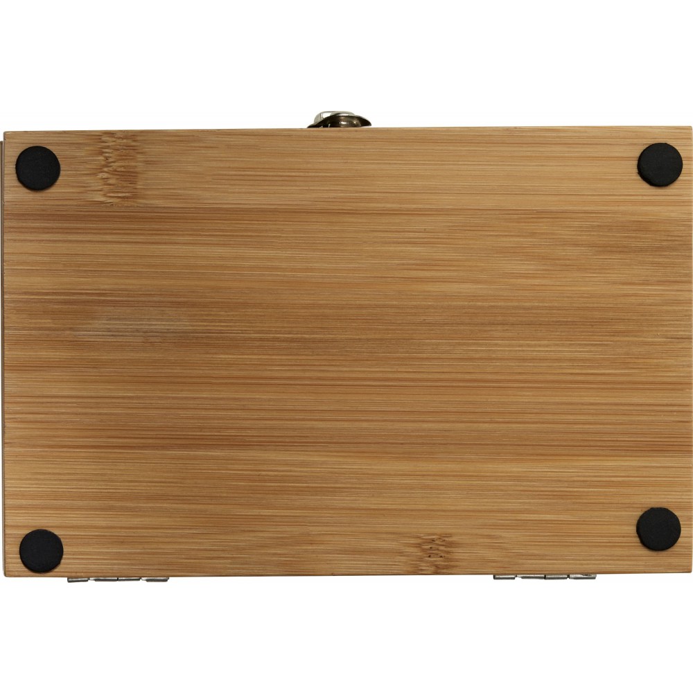 Tartalma: pincérbicska, üvegdugó, cseppfogó. Csomagolása bambusz díszdoboz. Bambusz és BPA-mentes műanyag. Emblémázás: Tamponnyomás