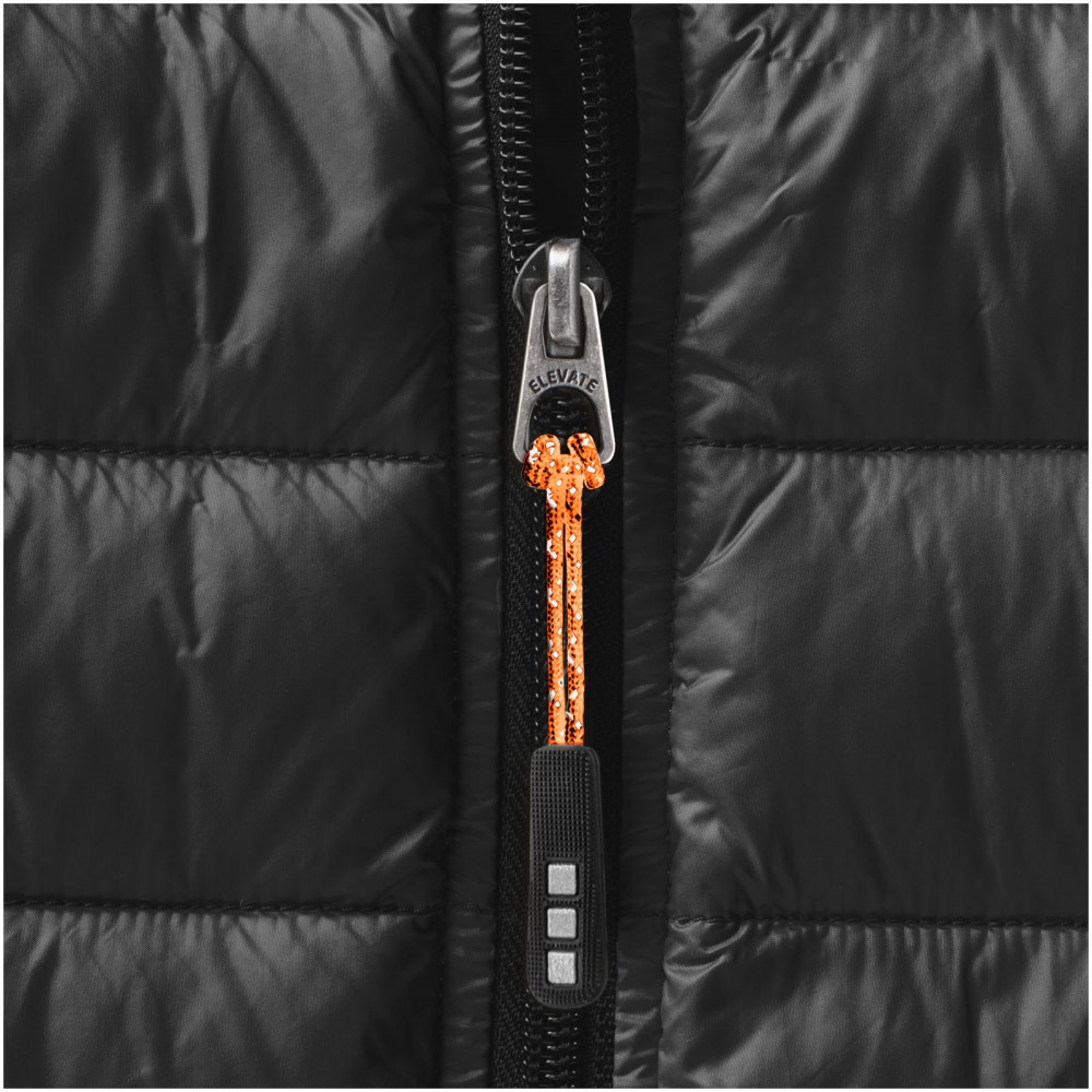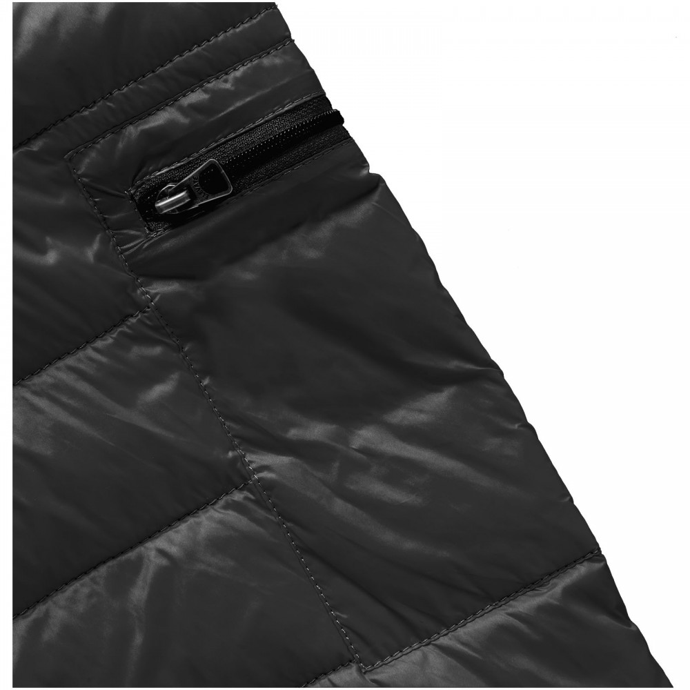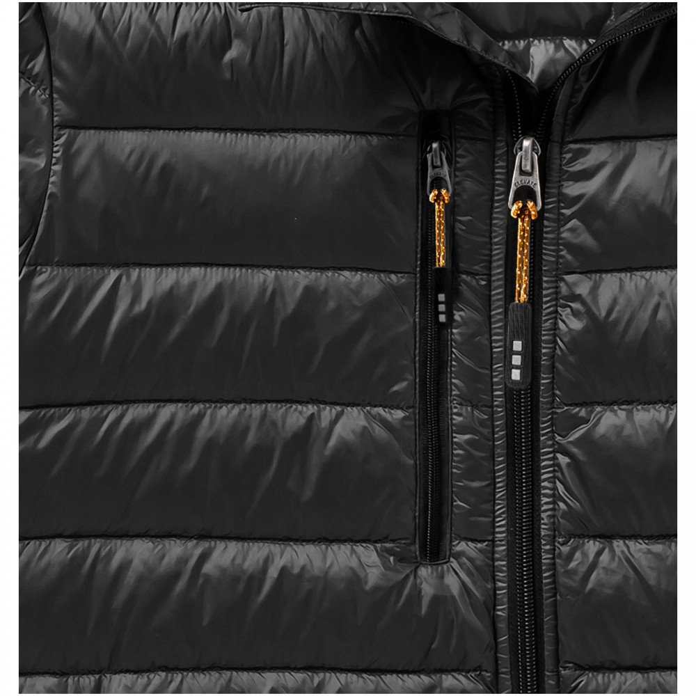 Normál szabásvonal. Pehelybiztos anyag. Cipzáros mell- és oldalzsebek. Emblémázásra alkalmas, cipzáros karzseb. Gumis szegély az aljon és a karöltőben. Könnyen megfogható cipzárhúzókák . Szél elleni állvédő betét a nyaknál. Vízlepergető, lélegző és szélálló. Hátul fényvisszaverő logónyomat . Könnyű, szigetelt pehelydzseki. 100% nylon, szőtt anyag, dupla vízlepergető bevonat, 20D. 80% pehely és 20% toll töltet. 115 g/m2 Emblémázás: Hímzés