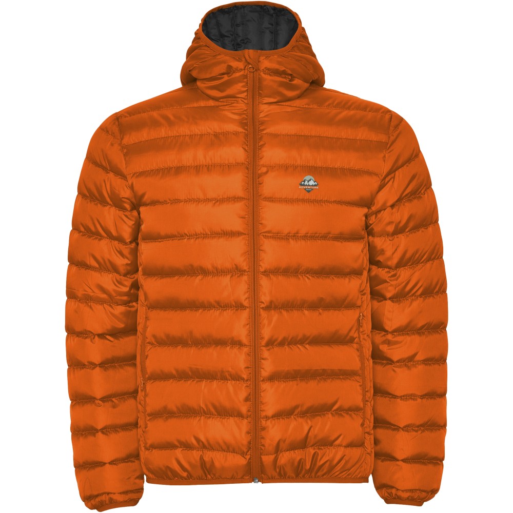 Pehely tapintású férfi steppelt dzseki kapucnival, tasakkal. Fordított cipzárakkal, hozzá illő állvédővel. Két cipzáras elülső zseb. Gumis kézelő, a alj- és a kapucniszegély. Kontrasztos belső bélés. Könnyű és összehajtható ruhadarab. Vízálló. Szélálló modell. 100% poliészter, 290 g/m2. Bélés: 100% poliészter. Töltet: 100% poliészter. Emblémázás: Hímzés