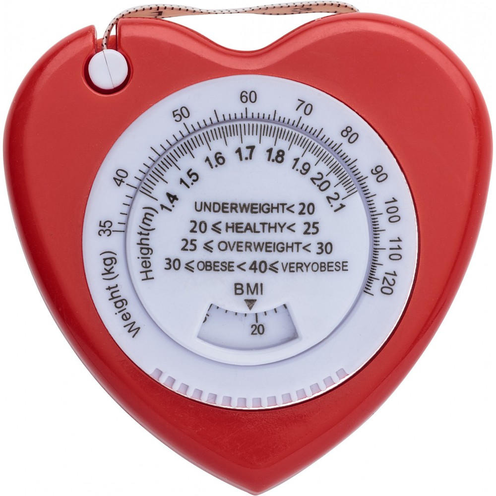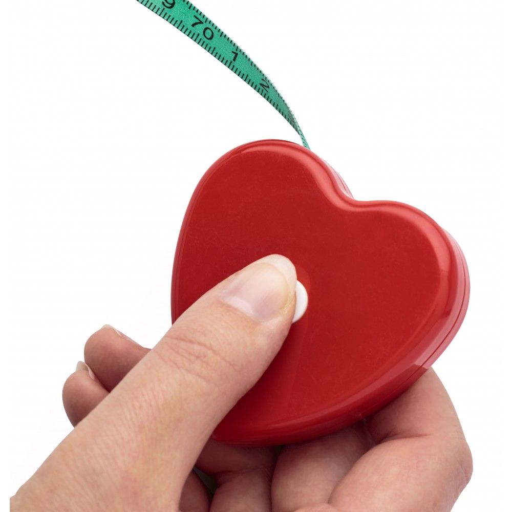 Szív alakú, BMI (testtömeg index) számításra is alkalmas, 1,5 méteres, műanyag mérőszalag. Emblémázás: Tamponnyomás