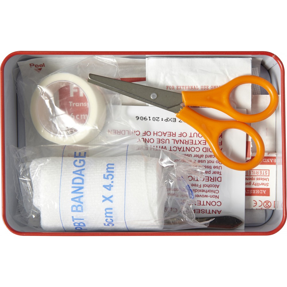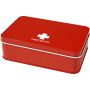 Elsősegélykészlet fém dobozban 15 kellékkel: olló, nedves törlőkendő, ragtapasz, 4 alkoholos törlőke, 5 ragtapasz, 1 gézlap, 1 fertőtlenítő törlő. Emblémázás: Tamponnyomás, UV nyomtatás