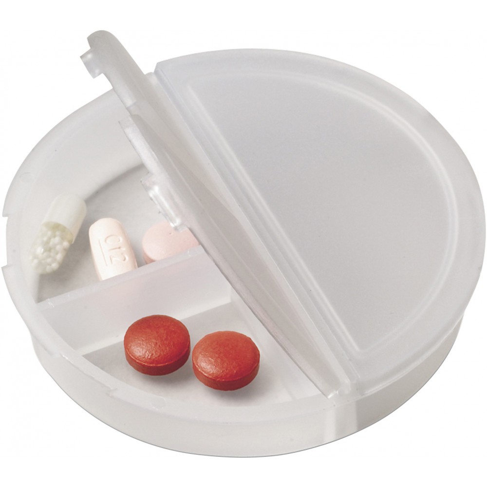 Kerek gyógyszertartó doboz 3 rekesszel. Átlátszó BPA-mentes műanyag. Emblémázás: Tamponnyomás, UV nyomtatás