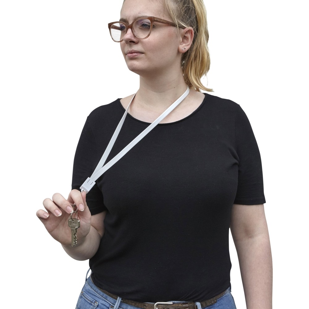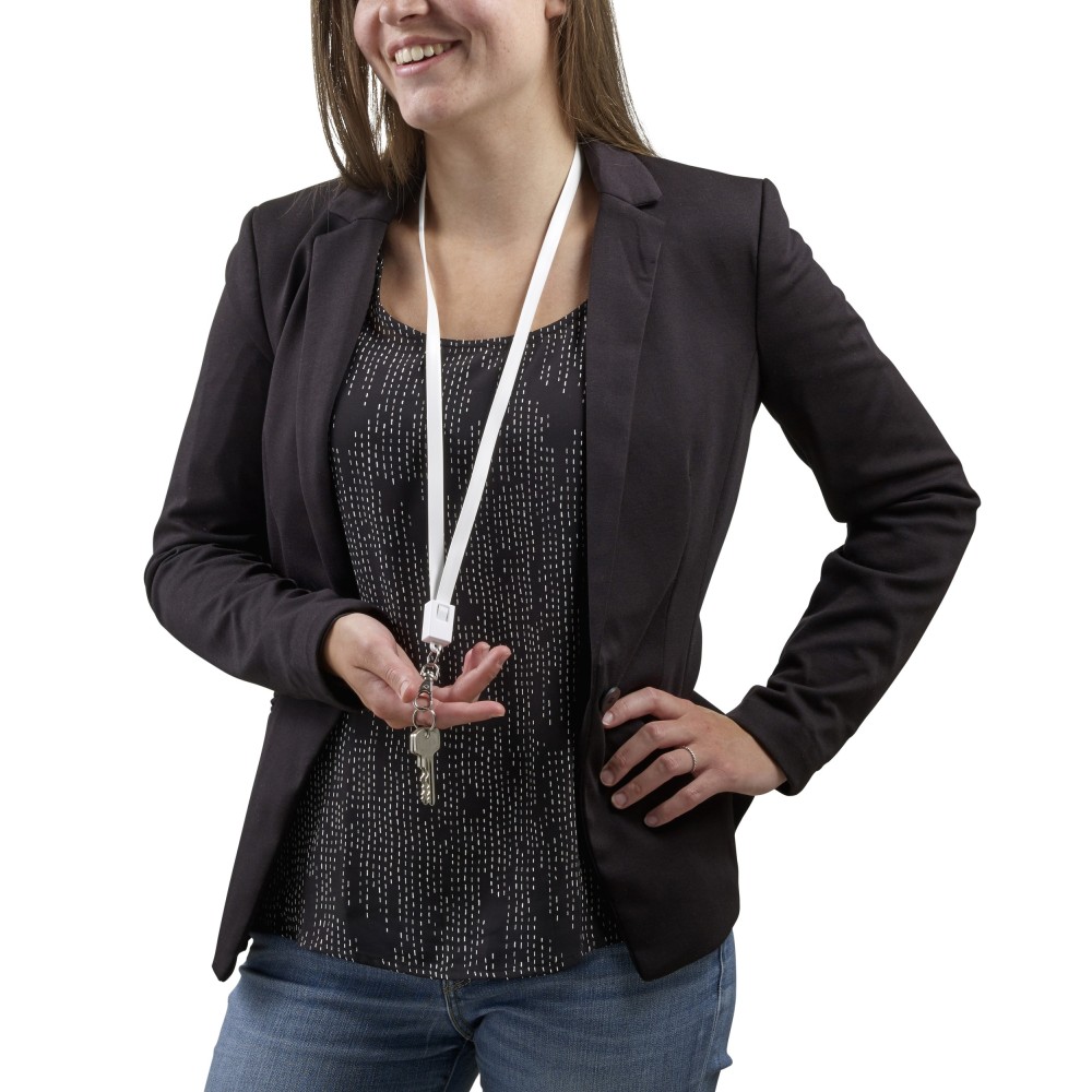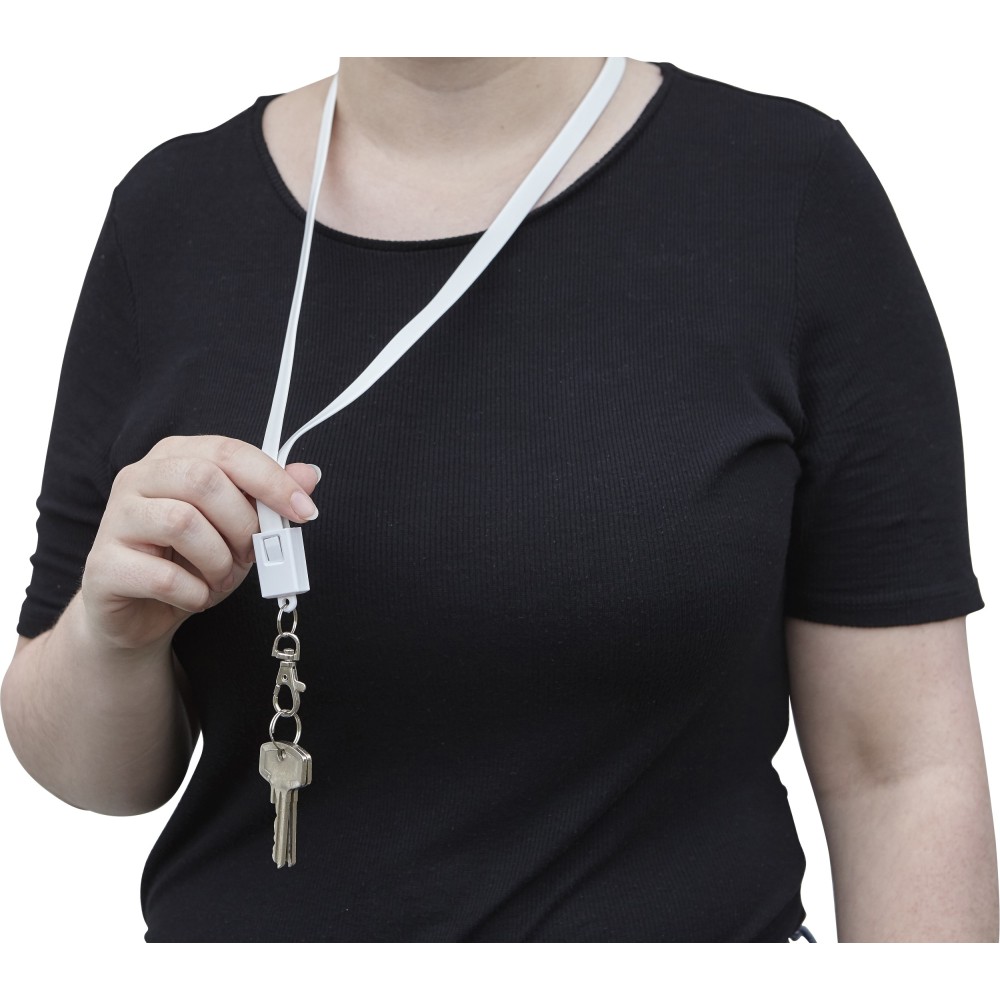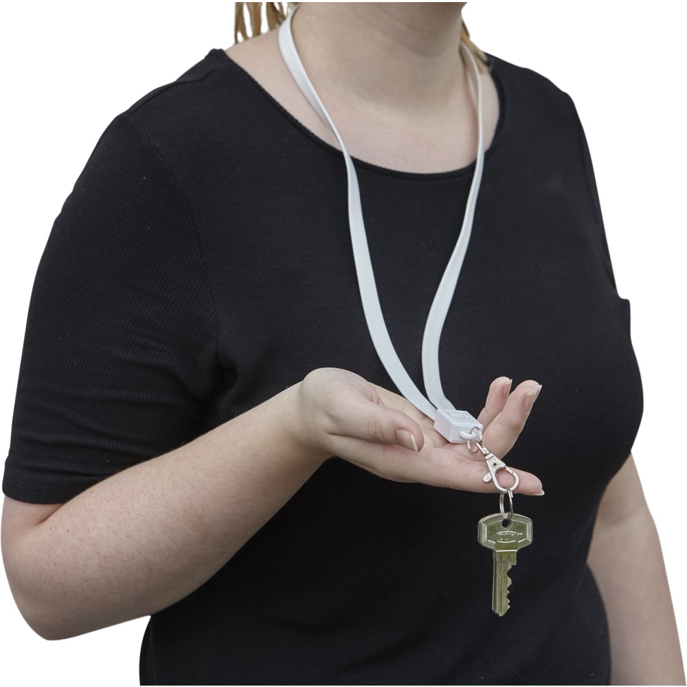 USB, micro USB és lightning töltőkábel és nyakpánt egyben. Hossza kb. 90 cm. Cseppkarabinerrel érkezik. Emblémázás: Tamponnyomás