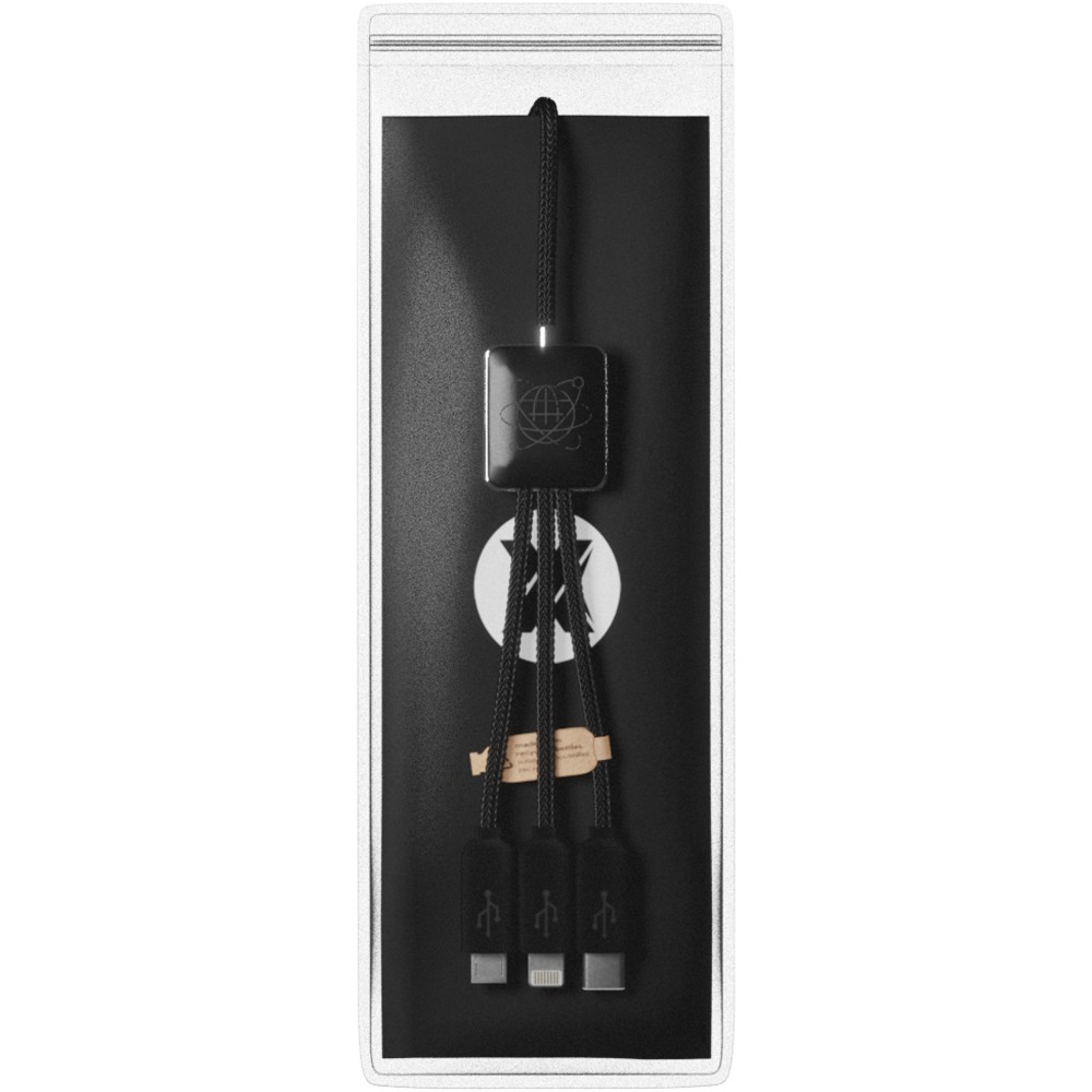 5 az 1-ben újrahasznosított PET világító logóval ellátott töltő- és adatátviteli kábel műanyag házzal. A világító logó mindkét oldalán látható. 3 csatlakozóval (C típusú, Micro USB, iPhone) és kettős USB csatlakozóval rendelkezik az univerzális használatra. A kábel lehetővé teszi az adatátvitelt bármilyen típusú eszközhöz (USB-C + Lightning + Micro USB). TPU tasakban, nátronpapír kártyával szállítjuk. Kábel hossza: 1 méter. Újrahasznosított ABS műanyag, újrahasznosított PET műanyag. Emblémázás: Gravírozás