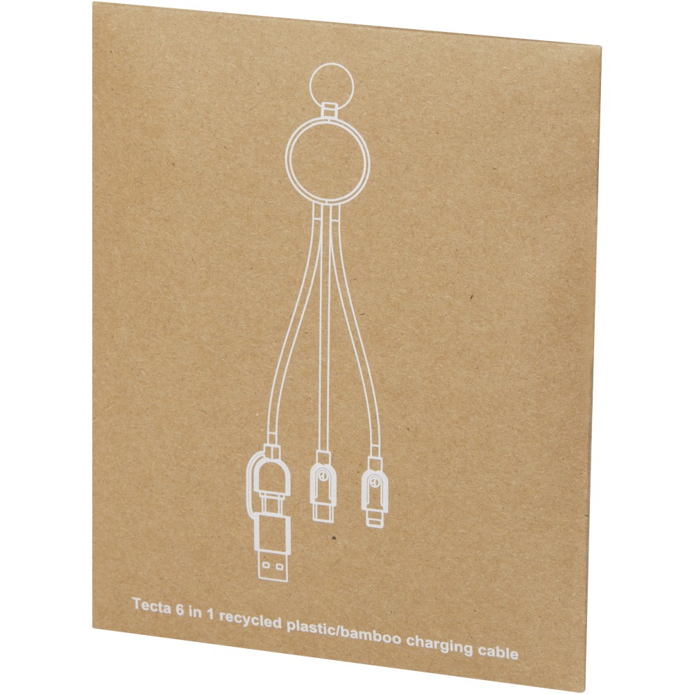 A Tecta 6 az 1-ben bambuszból és újrahasznosított műanyagból készült töltőkábel. Ez a 25 cm hosszú RTPE kábel 2A töltési teljesítményt biztosít. Bemenet: USB A és Type-C. Kimenet: Type-C, micro USB és 2 az 1-ben micro USB és Lightning dual tip iOS és Android eszközökkel is kompatibilis. Az alumínium USB-csatlakozók biztonságos és stabil kapcsolatot biztosítanak, így minden alkalommal megbízható töltést biztosítanak. Az ezüst színű, rozsdamentes acél kulcstartó kényelmes módja a kábel rendszerezésének és szállításának. Nátronpapír borítékba csomagolva. Emblémázás: Gravírozás