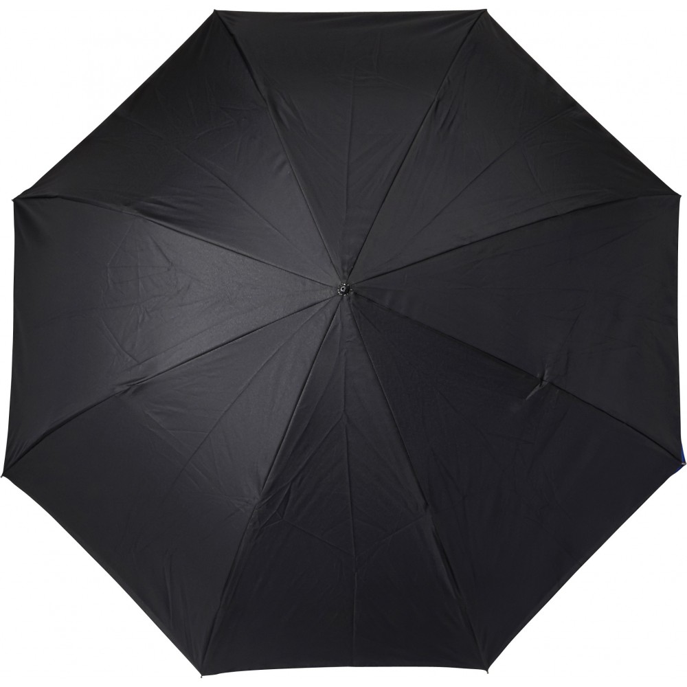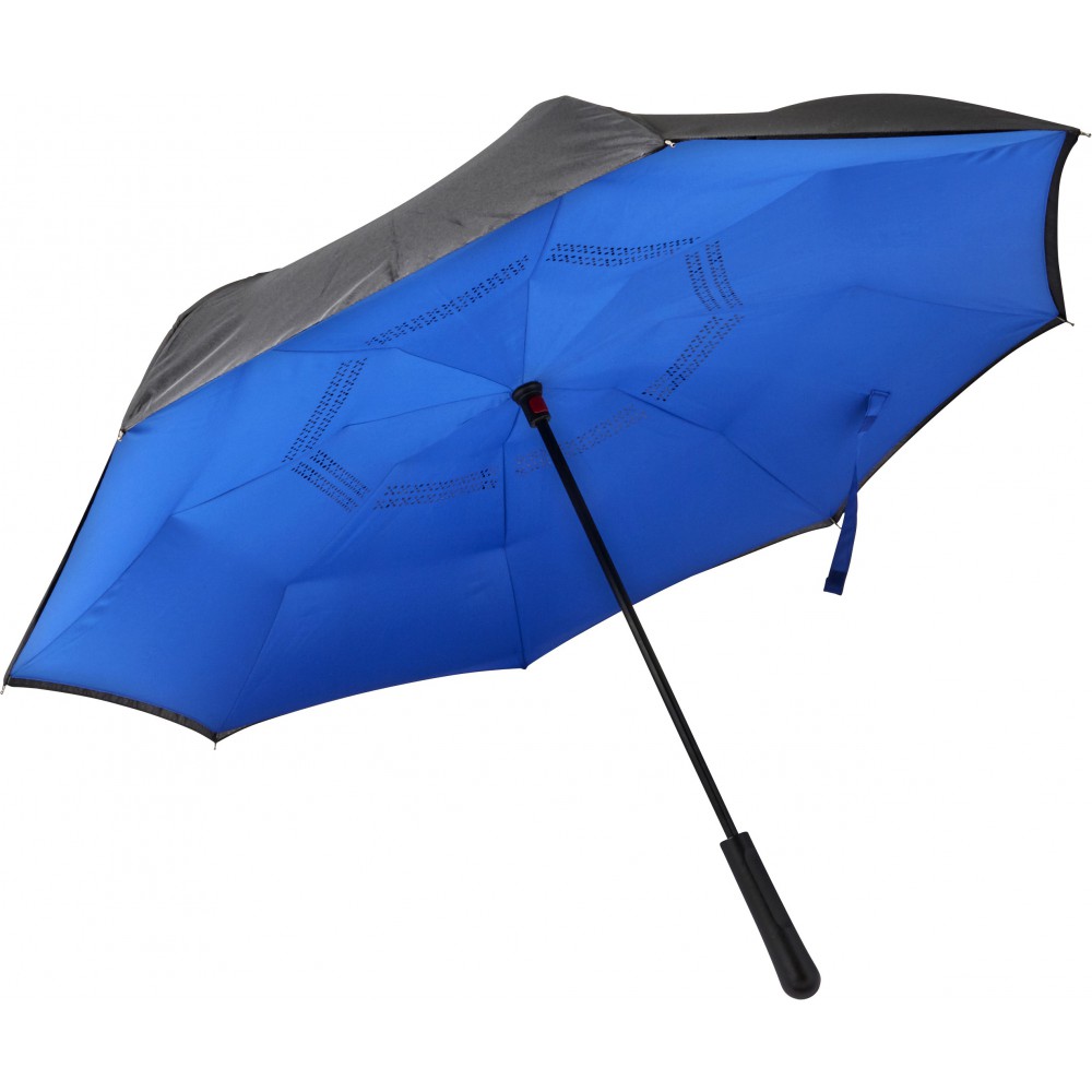 Innovatív, kiforduló szerkezetű, duplafalú esernyő, üvegszálas vázzal és műanyag fogóval. Tépőzáras. Emblémázás: Szitanyomás