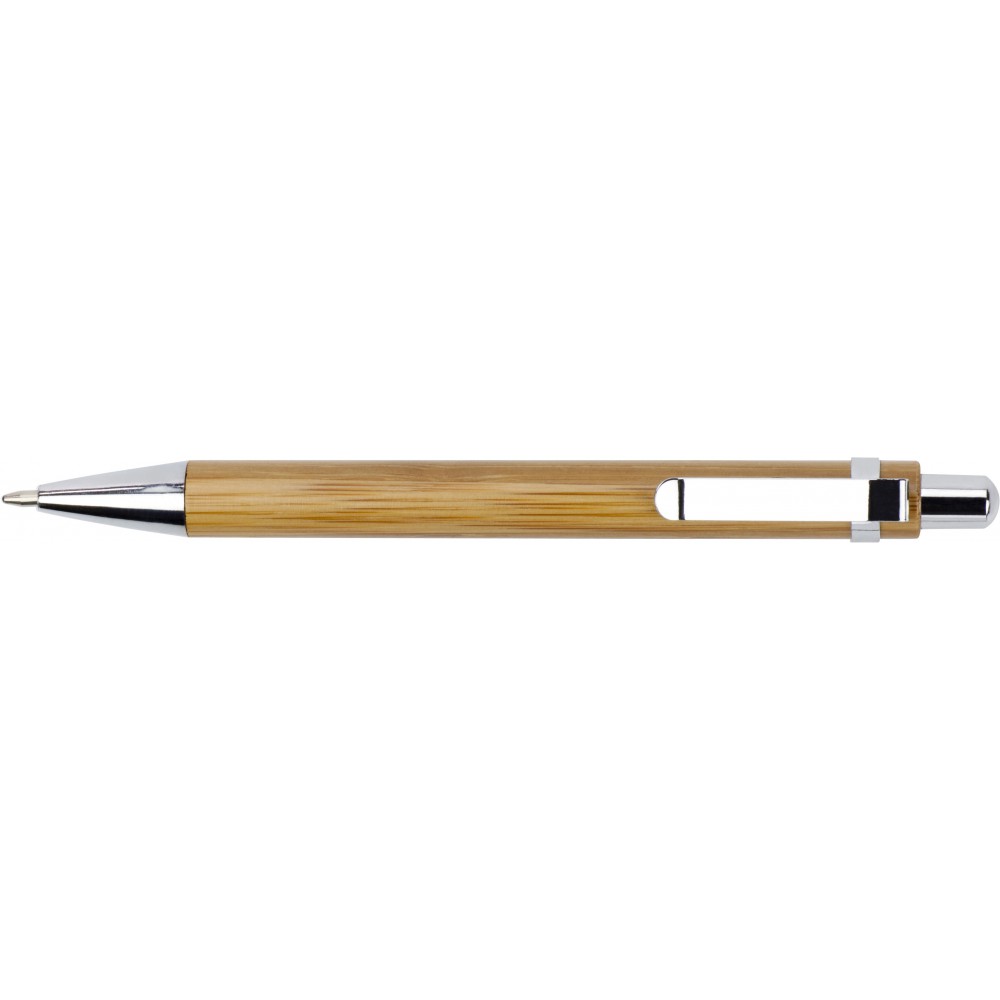 Bambusz golyóstoll fém kiegészítőkkel, kék tollbetéttel. Emblémázás: Gravírozás, Tamponnyomás, UV nyomtatás