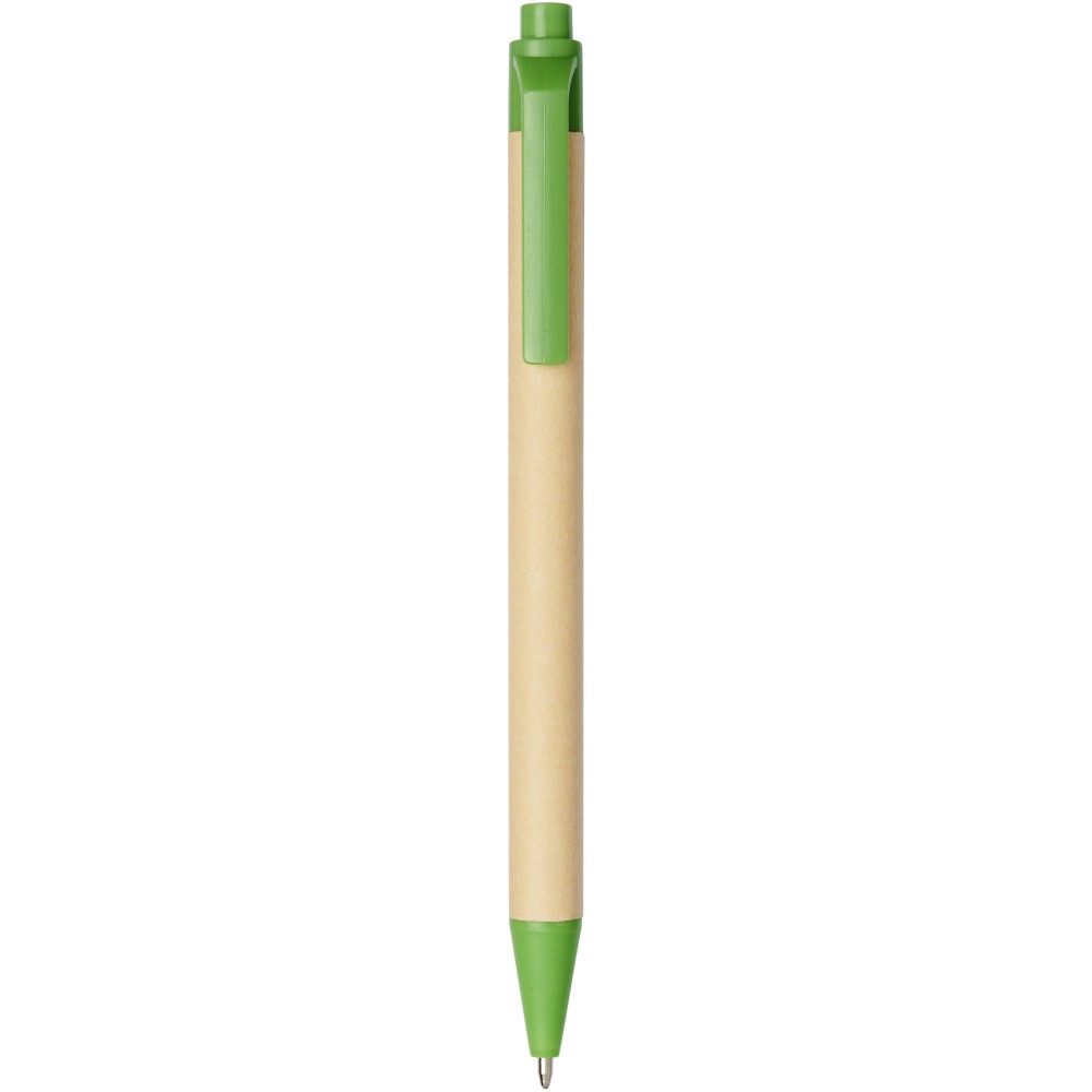 Környezetbarát golyóstoll fekete tollbetéttel, nyomógombos mechanizmussal, biológiailag lebomló papíranyagból készült tolltest és kukorica műanyag kiegészítők. Az újrahasznosított kartondoboz színe nem egységes. Emblémázás: Tamponnyomás, UV nyomtatás