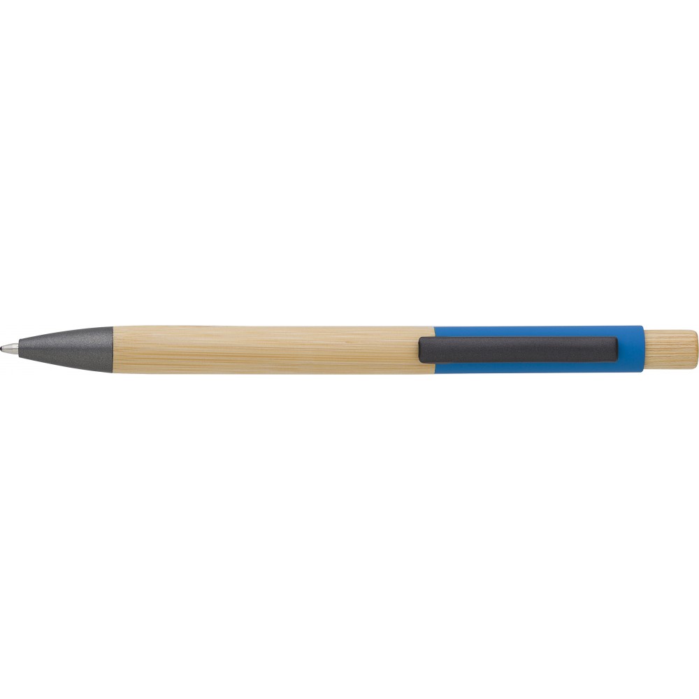 Bambusz golyóstoll alumínium kiegészítőkkel, kék tollbetéttel. Grafit színű hegy és klipsz, bambusz nyomógomb. Emblémázás: Gravírozás, Tamponnyomás