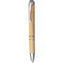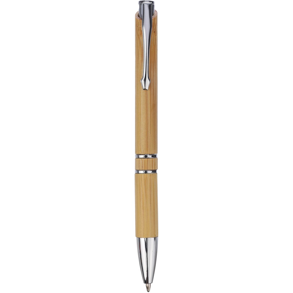 Bambusz golyóstoll krómozott fém részletekkel és nyomógombbal. Műanyag gyűrűkkel, nyomógombbal és tollheggyel. Fém klipsszel. Kb. 800 méter íráshossz. Fekete tollbetéttel. Emblémázás: Tamponnyomás, UV nyomtatás