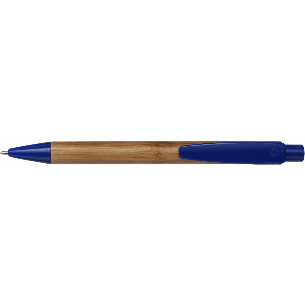 Bambusz golyóstoll műanyag kiegészítőkkel, kék tollbetéttel. Emblémázás: Gravírozás, Tamponnyomás, UV nyomtatás