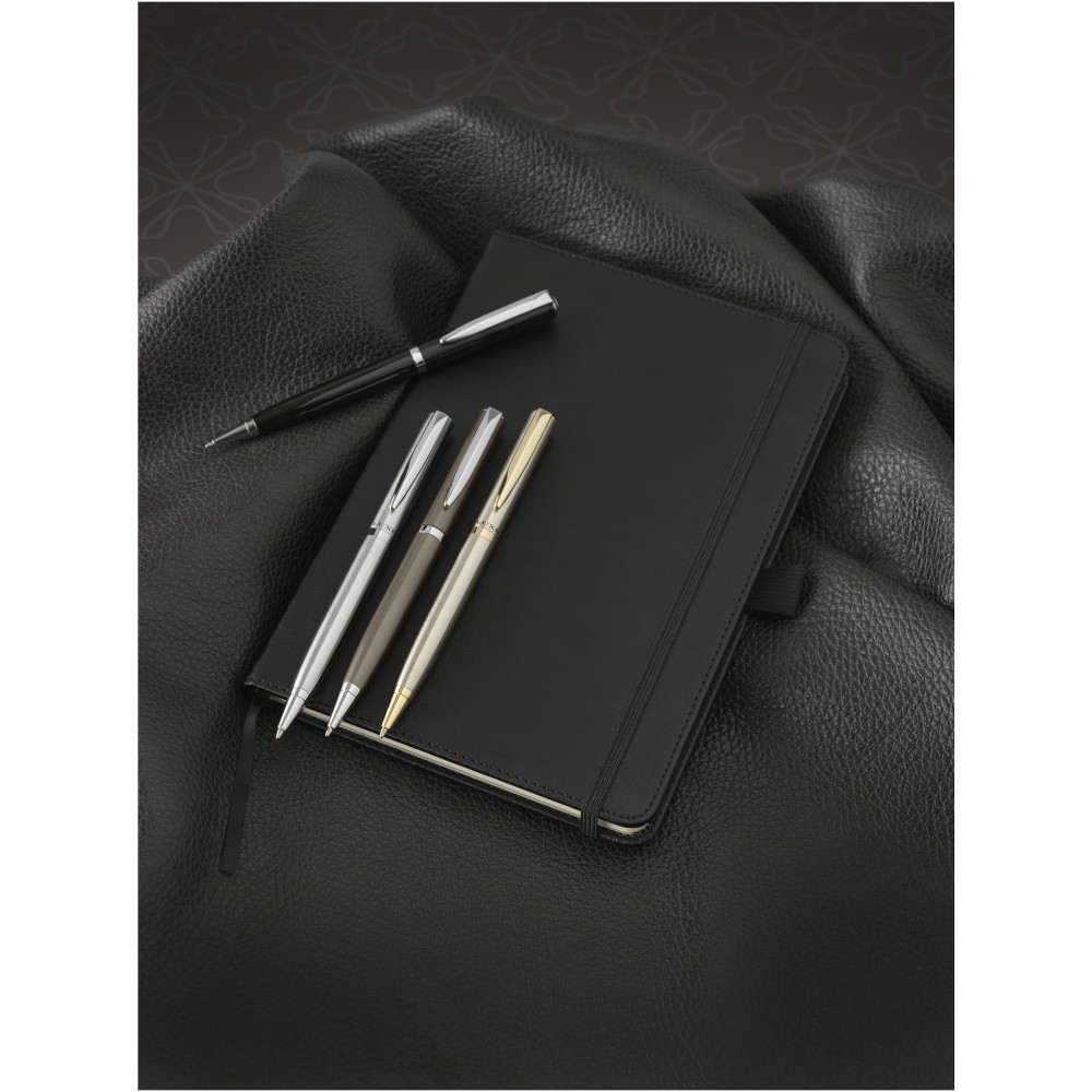 Kifinomult tervezésű golyóstoll matt arany felülettel és aranyozott részletekkel, valamint matt króm felülettel és króm kiegészítőkkel. Prémium minőségű fekete tollbetéttel. Csomagolása Luxe ajándékdoboz.Fém. Emblémázás: Gravírozás, Tamponnyomás