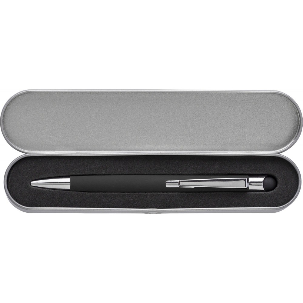 Golyóstoll gumis bevonattal, érintővel, fekete tollbetéttel. Csomagolása fém tolldoboz. Alumínium. Emblémázás: Gravírozás, UV nyomtatás