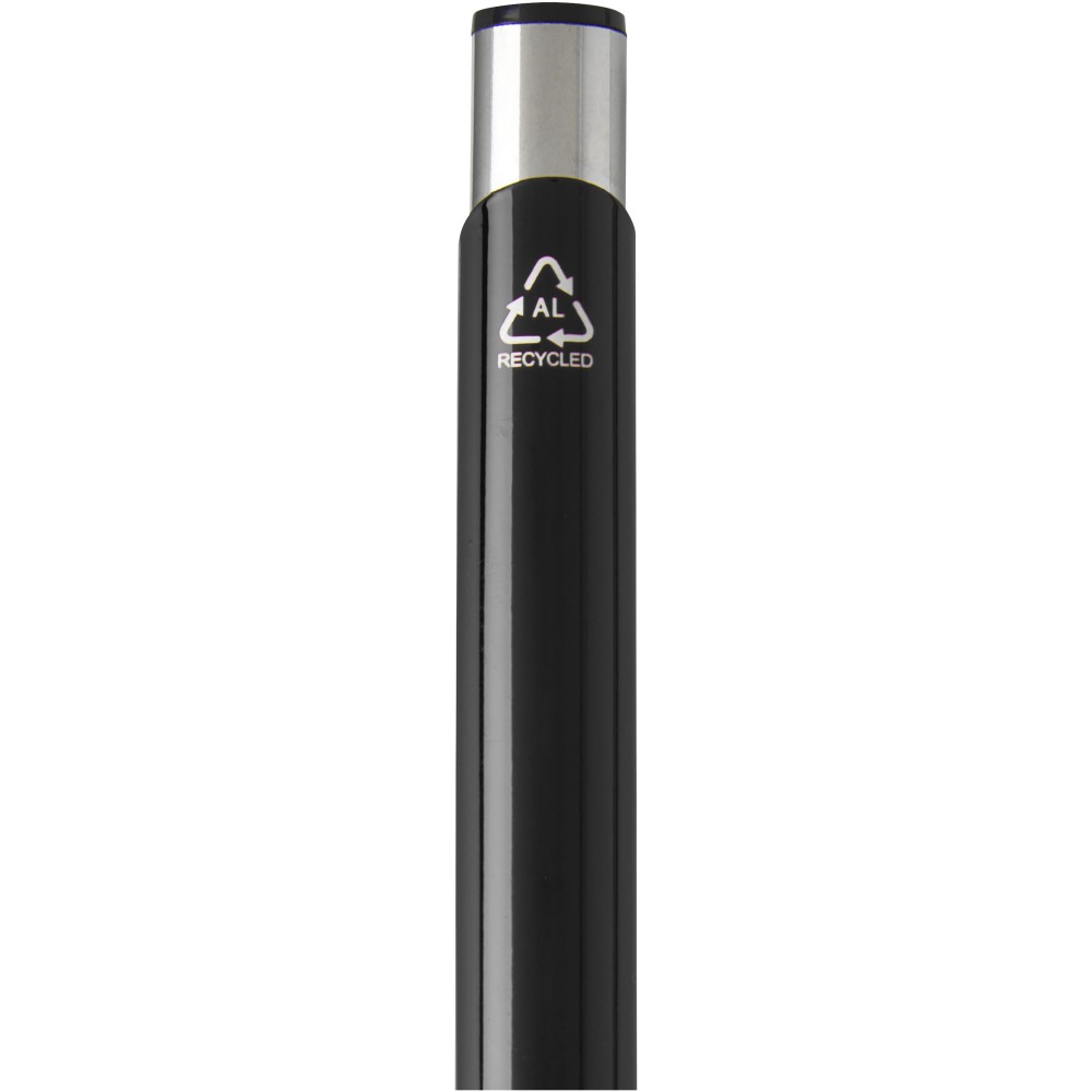 Újrahasznosított alumíniumból készült golyóstoll lakkozott, fényes felülettel és feltűnő króm részletekkel. Az újrahasznosított alumínium kevesebb energiát igényel, mint az alumínium nyersanyagokból történő előállítása, ami fenntarthatóbbá teszi a gyártást. Csökkenti a szemétlerakókba kerülő hulladék mennyiségét és segít a természeti erőforrások megőrzésében, az üvegházhatást okozó kibocsátás csökkentését célozva. Fekete tollbetéttel. Íráskapacitás: 600 méter. Újrahasznosított alumínium, ABS műanyag, vas. Emblémázás: Gravírozás
