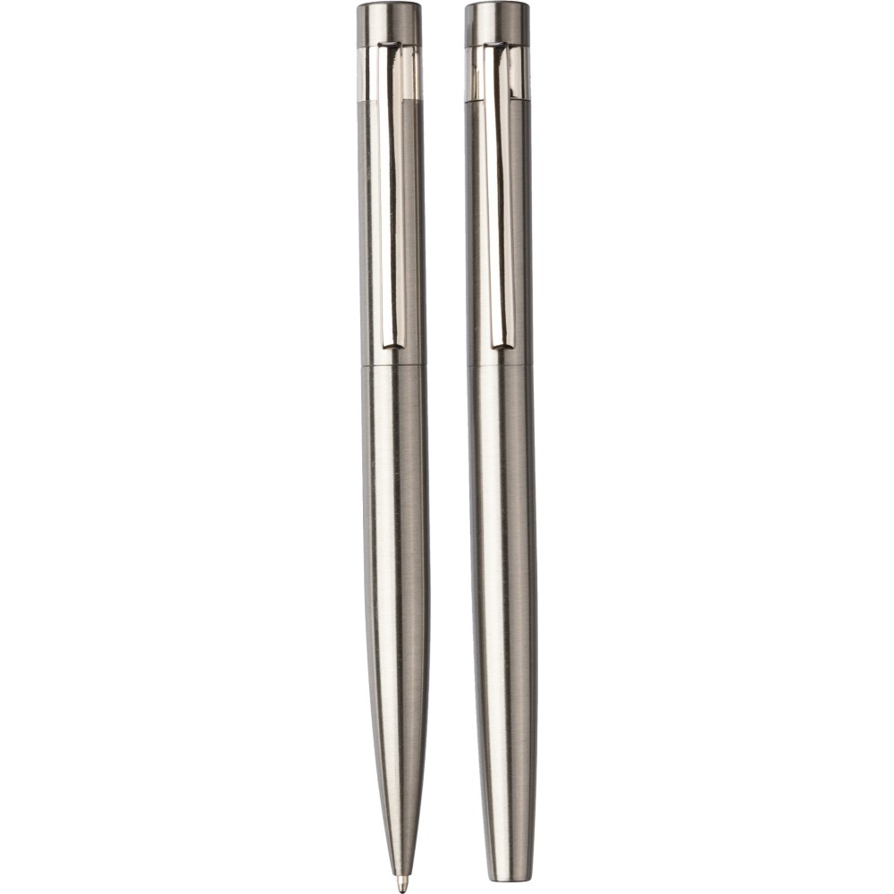 Újrahasznosított rozsdamentes acél tollkészlet, amely egy csavaros mechanikával rendelkező golyóstollat és egy rollerball tollat tartalmaz, mindkettő kék tollbetéttel érkezik. Mindkét toll hátoldalán az újrahasznosított rozsdamentes acél alapanyagot jelző logó található. Csomagolása nátronpapír díszdoboz. Emblémázás: Gravírozás