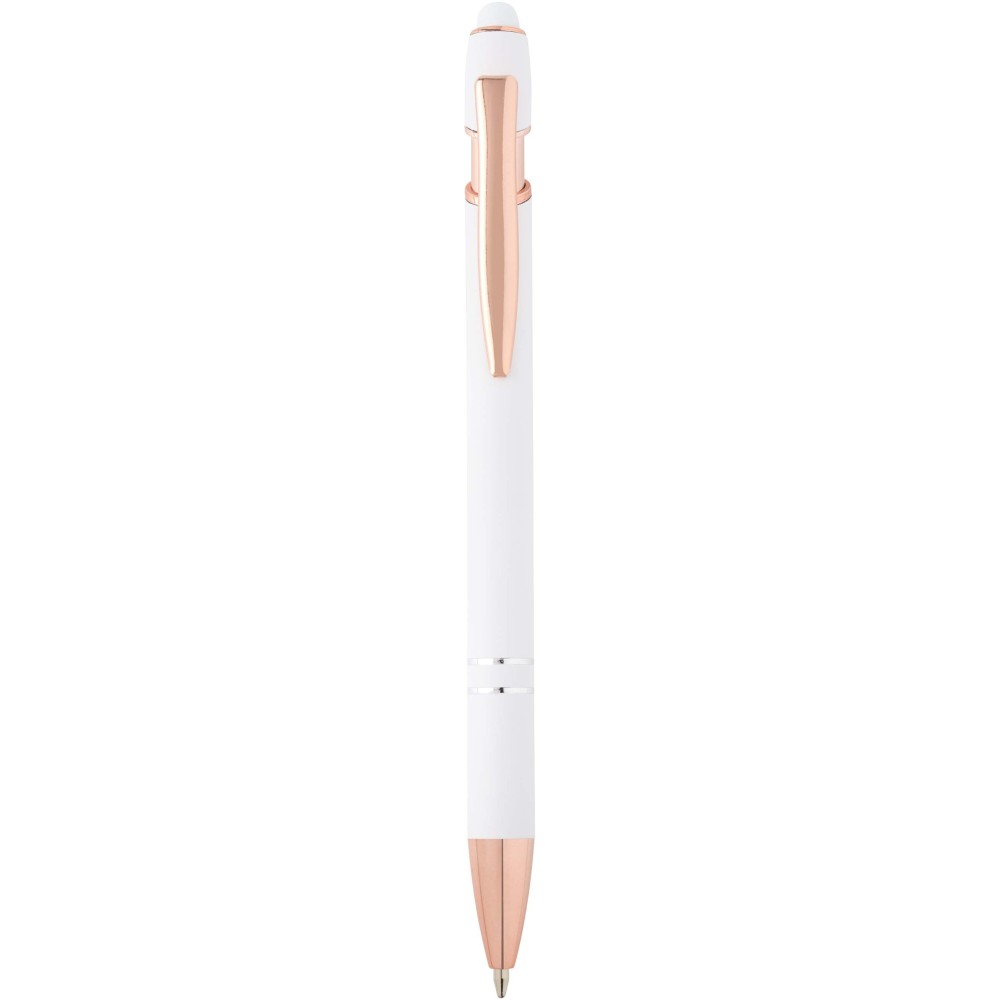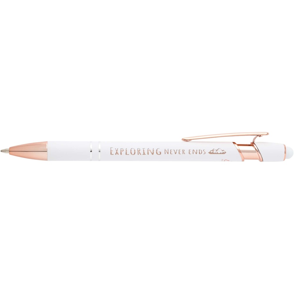 Nanna golyóstoll elegáns rózsaarany színben. A toll teste újrahasznosított alumíniumból, az érintőceruza pedig szilikonból készült, így érintőképernyős eszközökhöz is használható. Az újrahasznosított alumínium csökkenti a hulladéklerakók terhelését, segít megőrizni a természeti erőforrásokat, és célja az üvegházhatású gázok kibocsátásának mérséklése. Tinta színe: kék. Íráshossz: 800 méter. Tollhegy mérete: 1,0 mm. Emblémázás: Gravírozás, UV nyomtatás