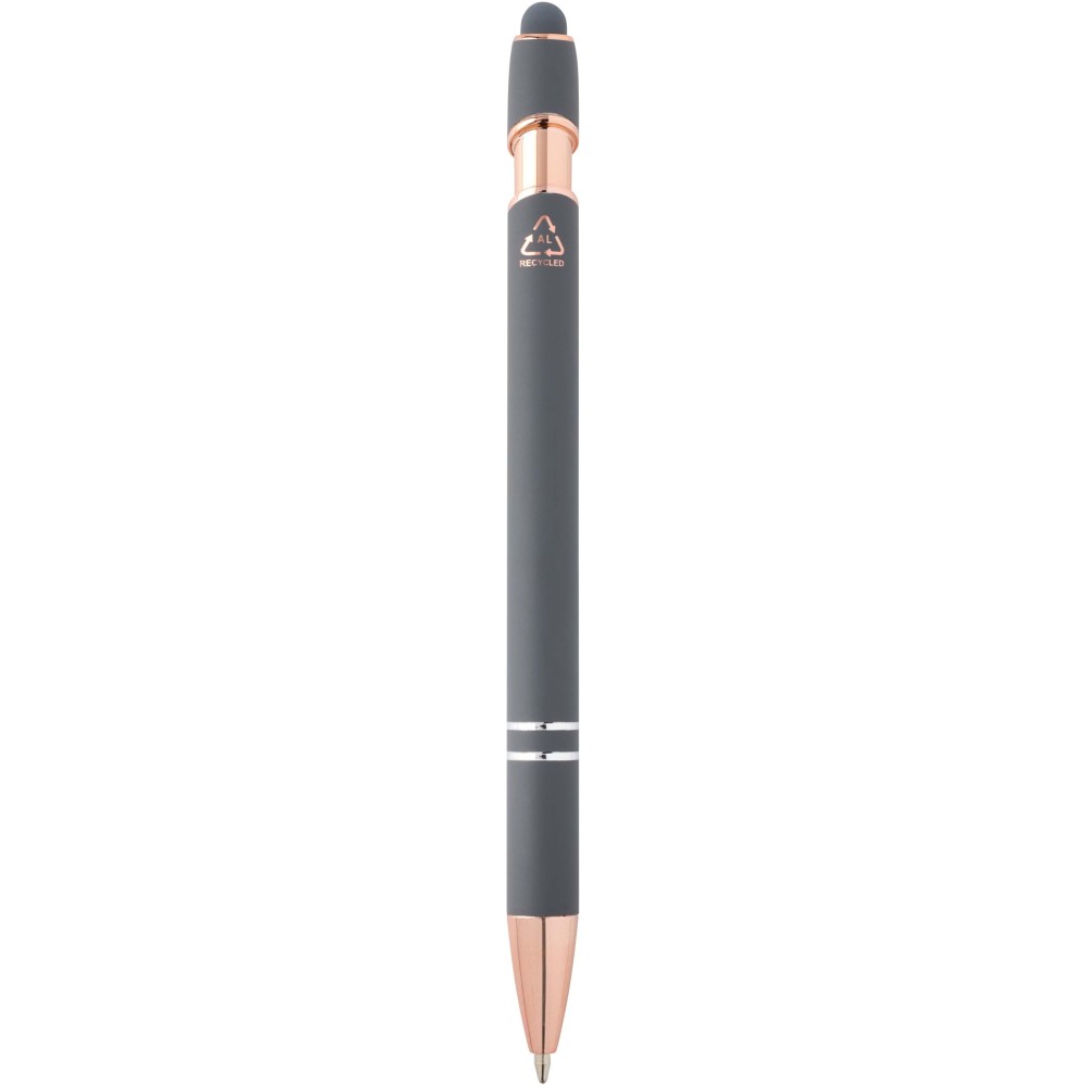 Nanna golyóstoll elegáns rózsaarany színben. A toll teste újrahasznosított alumíniumból, az érintőceruza pedig szilikonból készült, így érintőképernyős eszközökhöz is használható. Az újrahasznosított alumínium csökkenti a hulladéklerakók terhelését, segít megőrizni a természeti erőforrásokat, és célja az üvegházhatású gázok kibocsátásának mérséklése. Tinta színe: kék. Íráshossz: 800 méter. Tollhegy mérete: 1,0 mm. Emblémázás: Gravírozás, UV nyomtatás