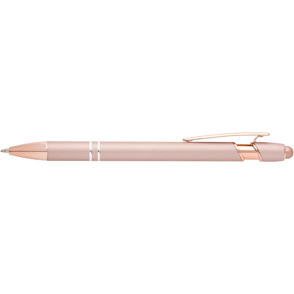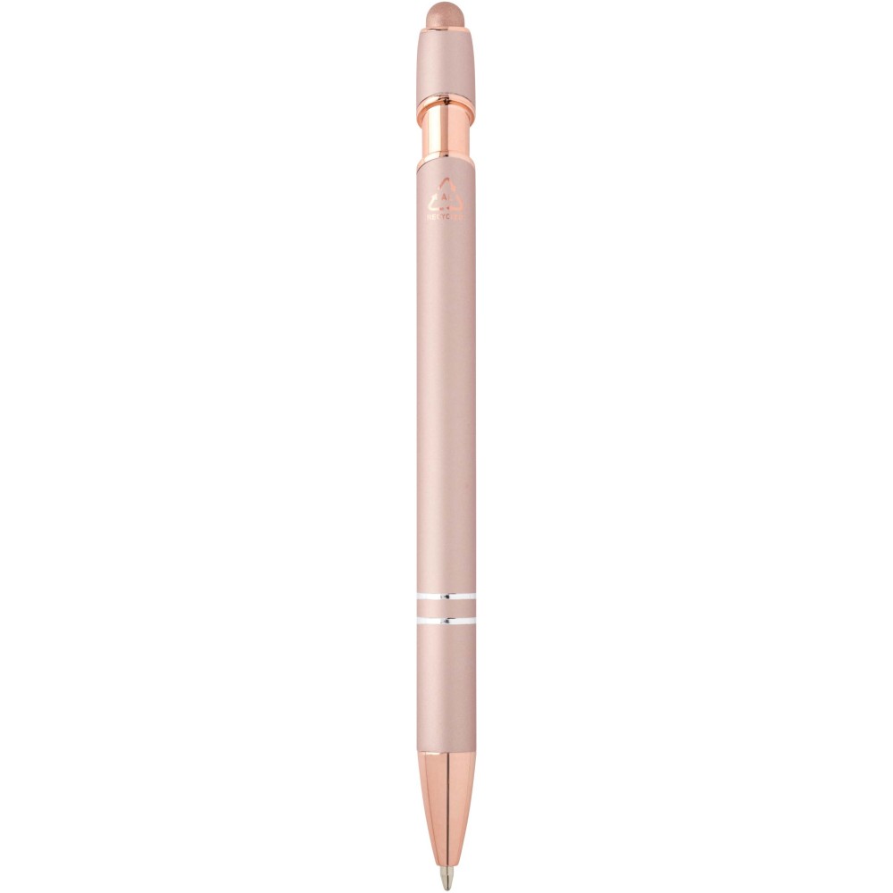 A Nanna golyóstoll rózsaarany bevonattal újrahasznosított alumíniumból készült tolltesttel és szilikon, érintőképernyős véggel rendelkezik. Az újrahasznosított alumínium csökkenti a hulladék mennyiségét a lerakókban, hozzájárul a természeti erőforrások megőrzéséhez és a károsanyag-kibocsátás mérsékléséhez. Tinta színe: fekete. Íráshossz: 800 méter. Tollhegy mérete: 1,0 mm. Emblémázás: Gravírozás, UV nyomtatás
