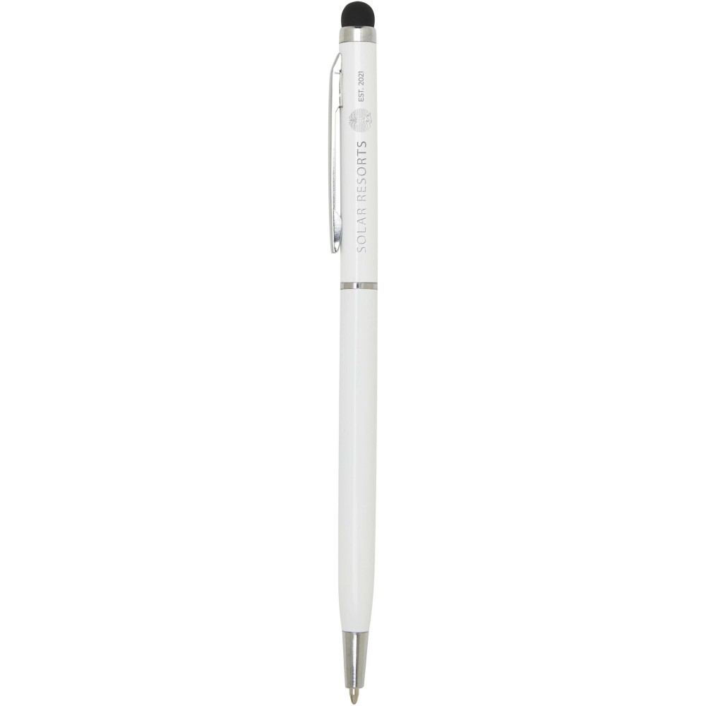 Ez a sokoldalú érintőceruzával ellátott golyóstoll tartós alumíniumból készült. A toll sima írást biztosít, míg a beépített érintőképernyős vég a pontos online navigációhoz ideális. Tinta színe: kék. Íráshossz: 1000 méter. Tollhegy mérete: 1,0 mm. Emblémázás: Gravírozás