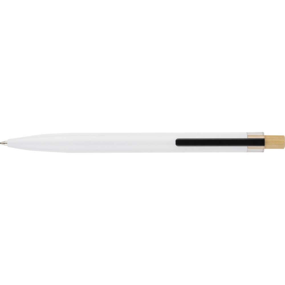 Újrahasznosított alumíniumból készült, lakkozott, nyomógombos golyóstoll bambusz nyomógombbal, rPET díszítéssel és fém klippel. A tolltesten gravírozott recycled (újrahasznosított) alapanyagra utaló logó található. Megközelítőleg 700 méter íráshossz, kék tollbetéttel.