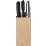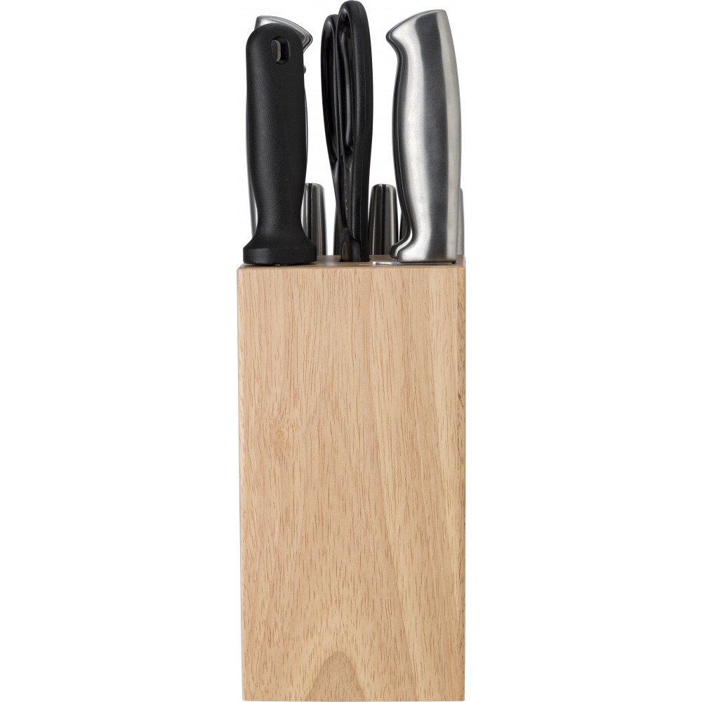 Konyhai készlet rozsdamentes acélból és PP műanyagból. A gumifa talp 13 db konyhai eszközt tartalmaz: olló, élező és különböző kések. Emblémázás: Gravírozás, Tamponnyomás