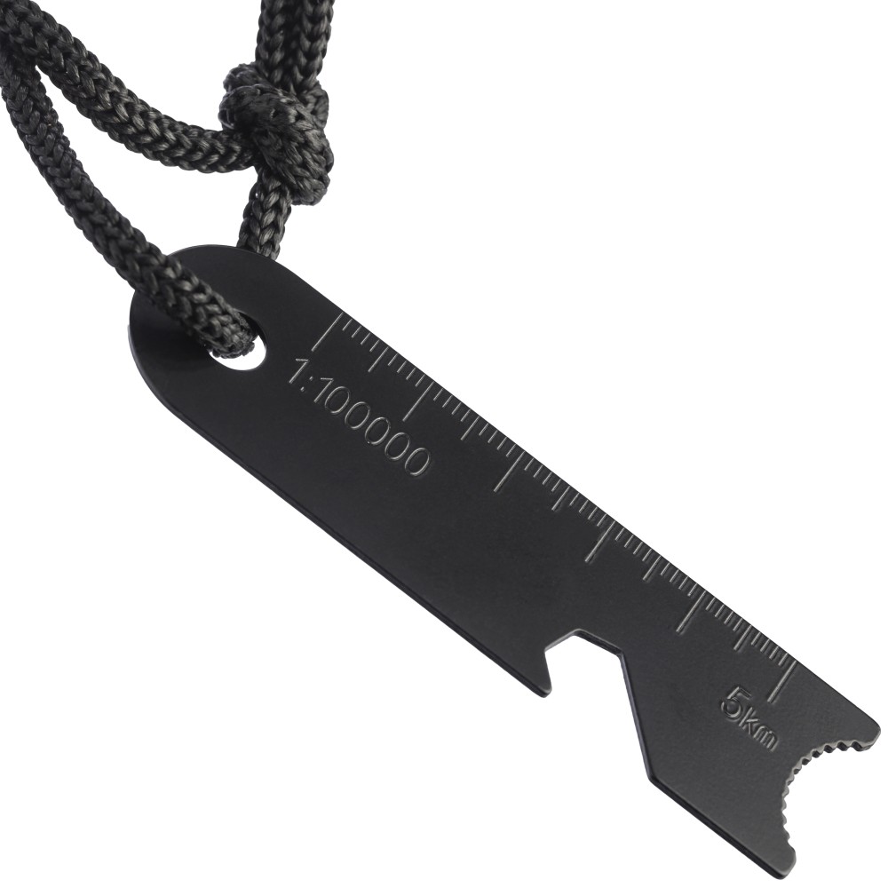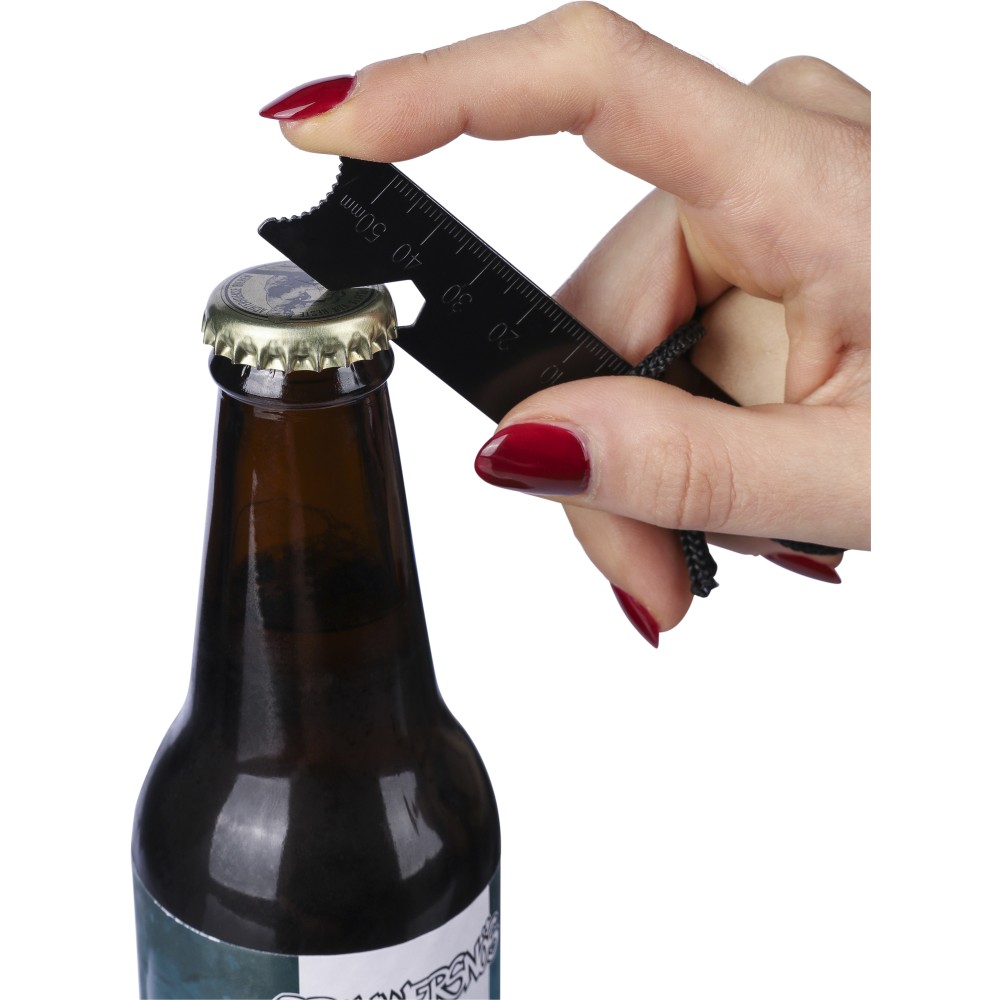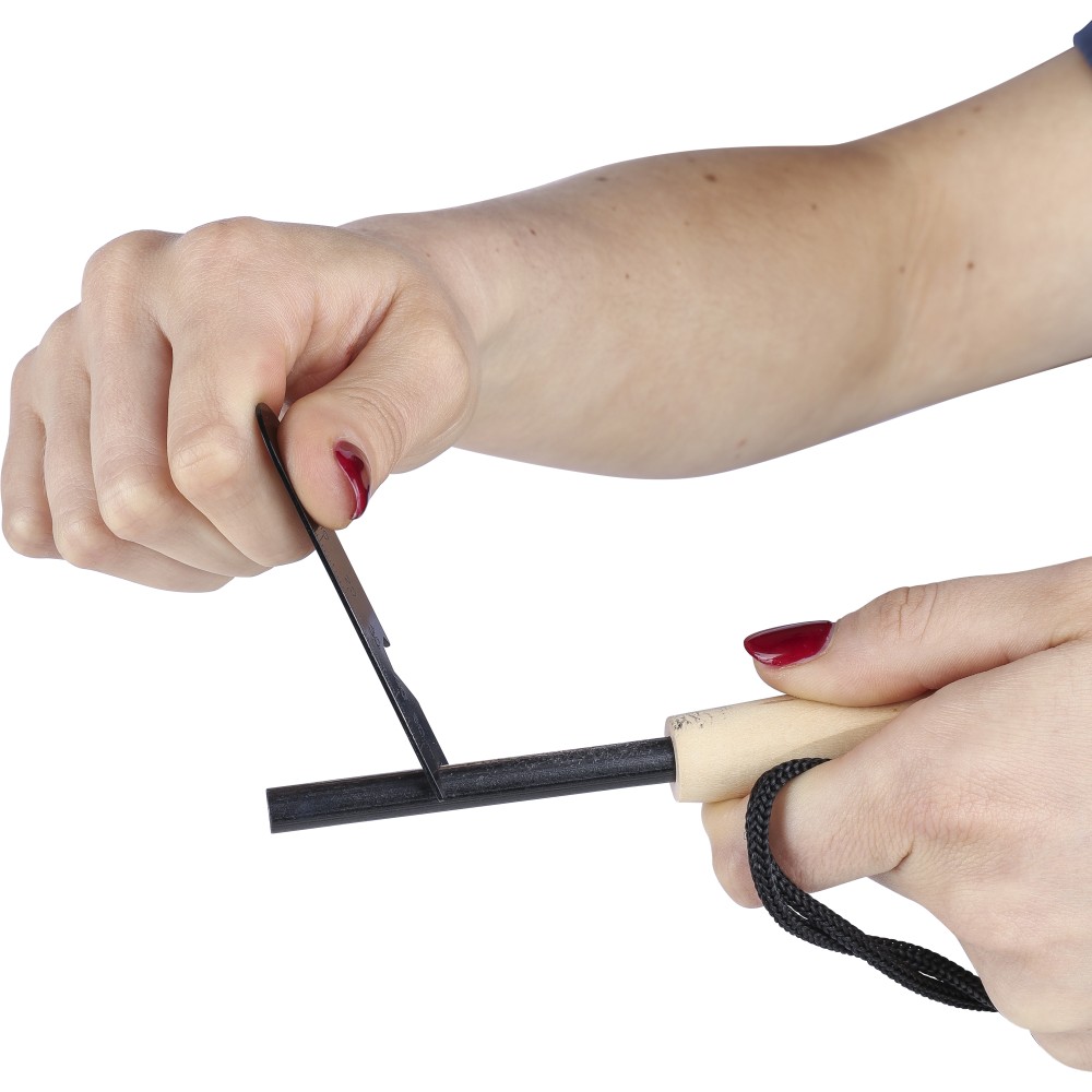 Rozsdamentes acél tűzgyújtó fenyő nyéllel és poliészter pánttal, mely csatlakoztatja a kaparóeszközt és a gyújtópálcát. A multifunkciós kaparóeszköz üvegnyitót, vonalzót és hex-kulcsot tartalmaz. Csomagolása barna papírdoboz. Emblémázás: Gravírozás