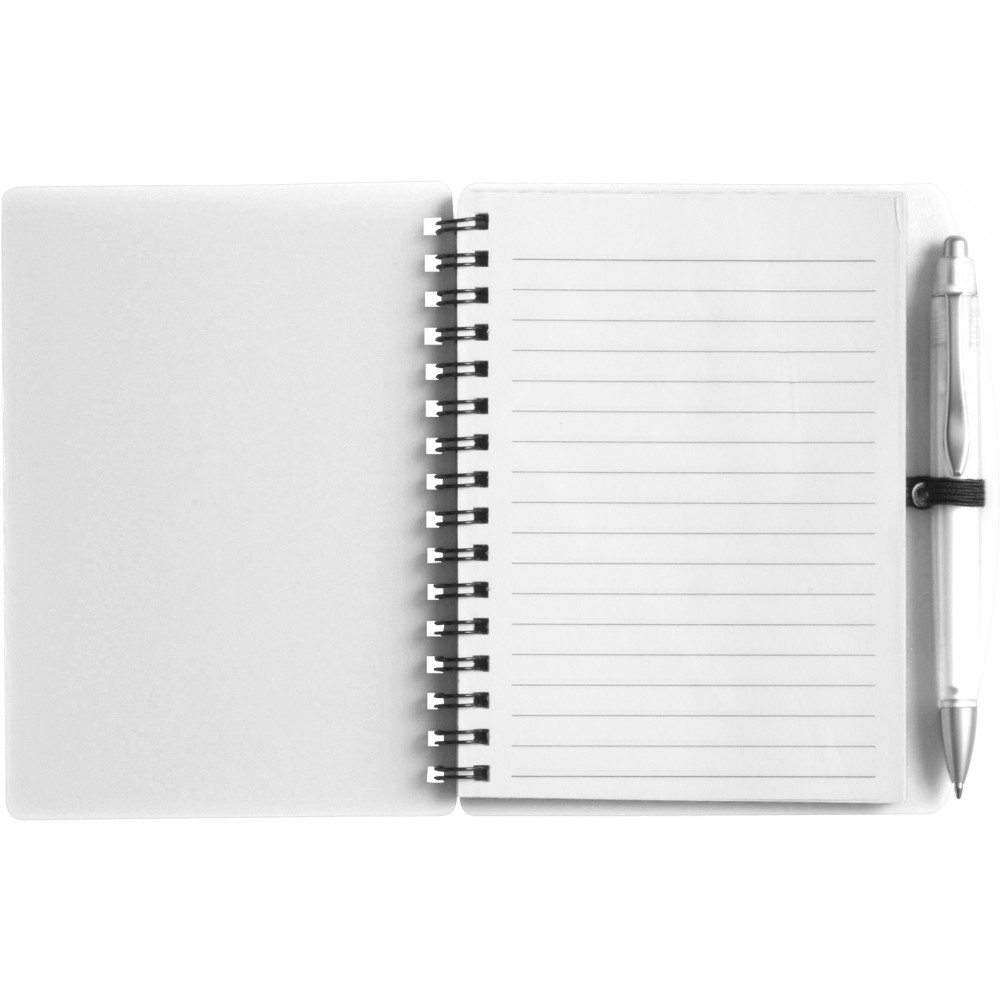 A6-os spirálfüzet PP borítóval, 65 lapos tömbbel, műanyag tollal, kék tollbetéttel. Emblémázás: Tamponnyomás