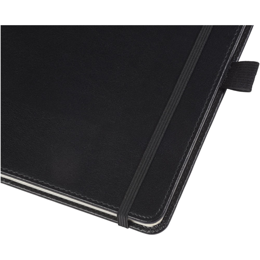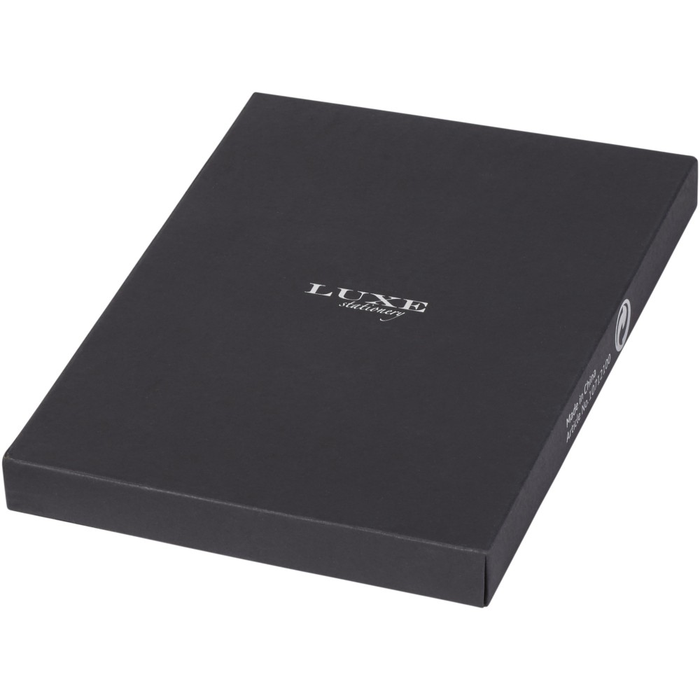 Kiválóan kialakított A5 méretű füzet, 80 db krémszínű vonalas lappal, belső merevítő lappal és tollhurokkal. Csomagolása Luxe ajándékdoboz. Műbőr. Emblémázás: Tamponnyomás, UV nyomtatás