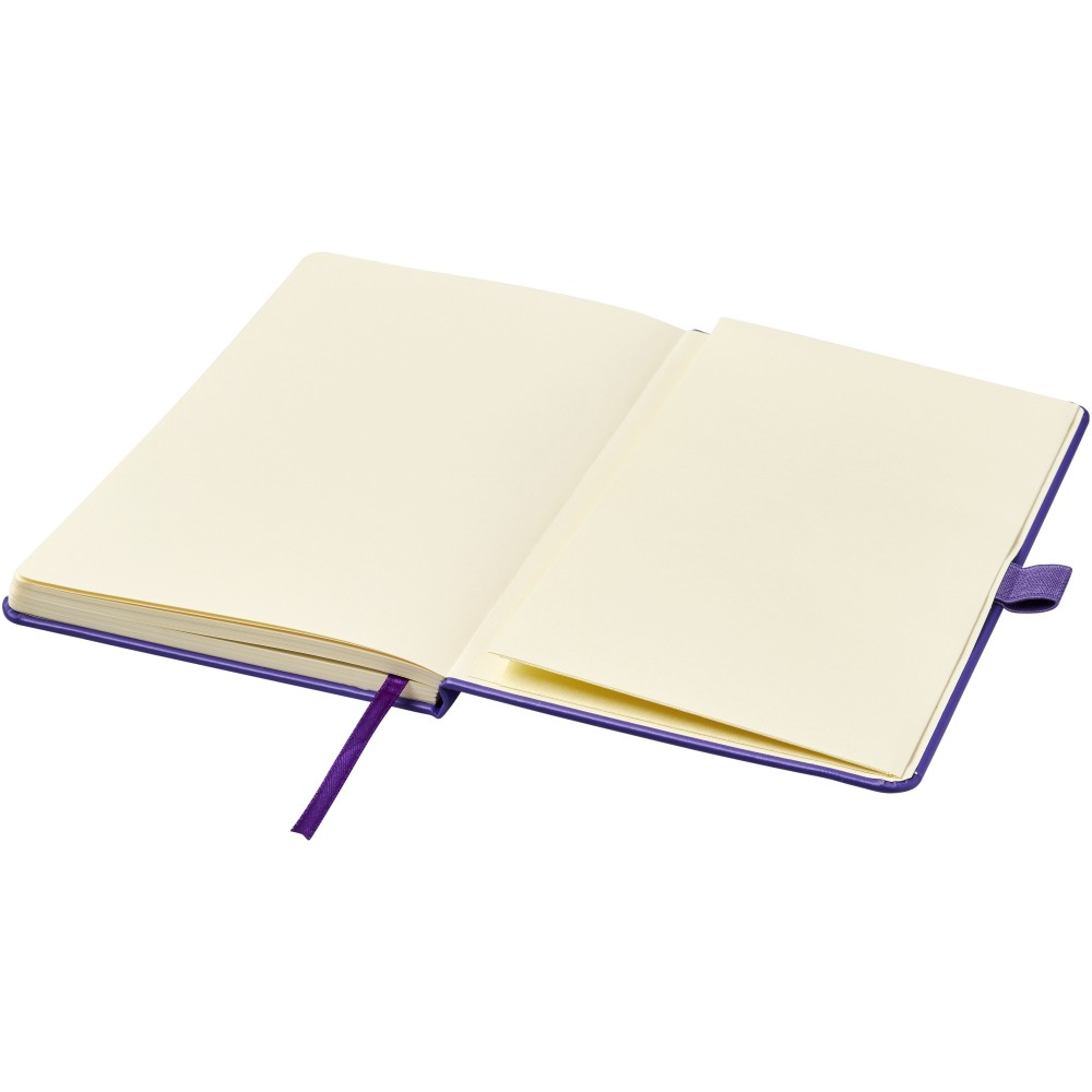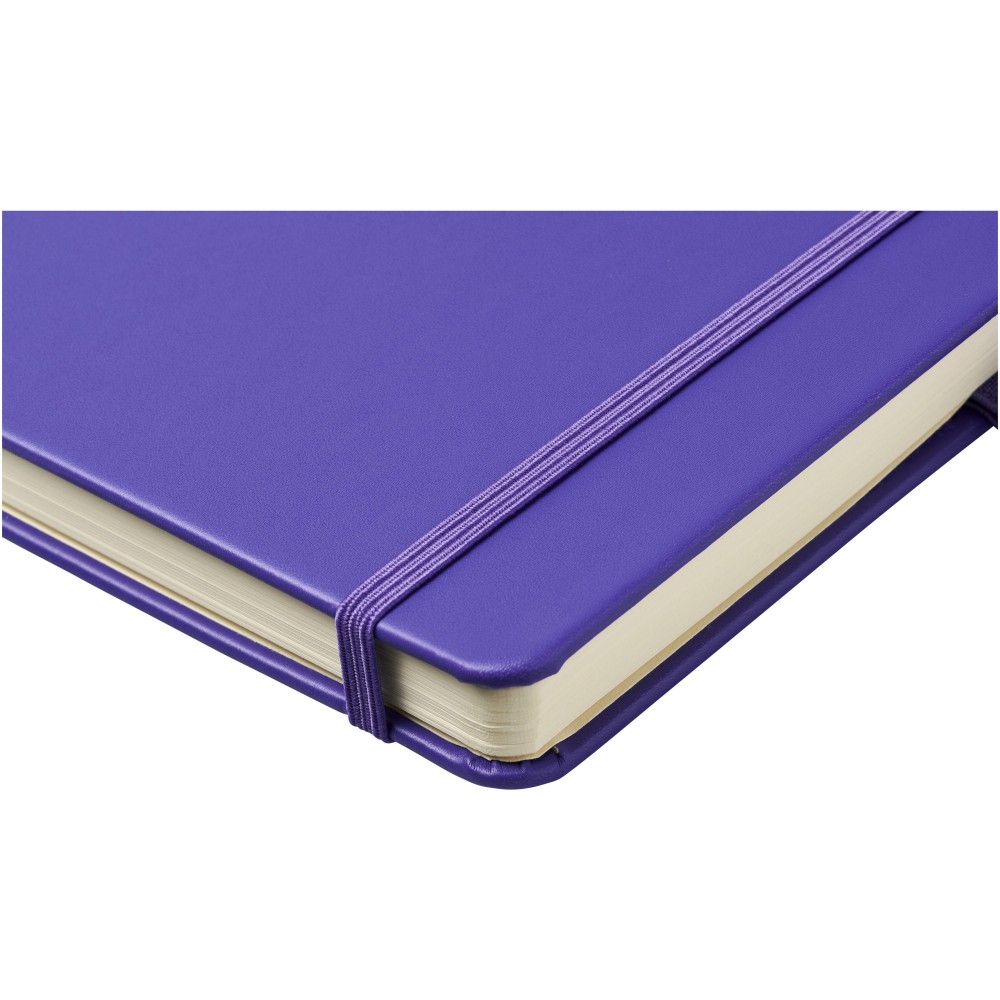 Műbőr A5-ös (14,2 cm x 21,4 cm) jegyzetfüzet gumiszalaggal, szalagjelölővel, tollhurokkal és harmonika hátsó zsebbel. 96 db vonalas krémszínű lapot tartalmaz (80 g/m2). Emblémázás: Tamponnyomás, UV nyomtatás