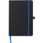 A5 füzet 96 vonalas lappal, könyvjelzővel, gumis zárópánttal. Lézergravírozás után a gravírozott felület színe megegyezik a gumipánt színével. PU anyag. Emblémázás: Tamponnyomás, UV nyomtatás
