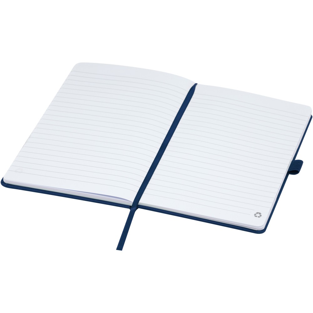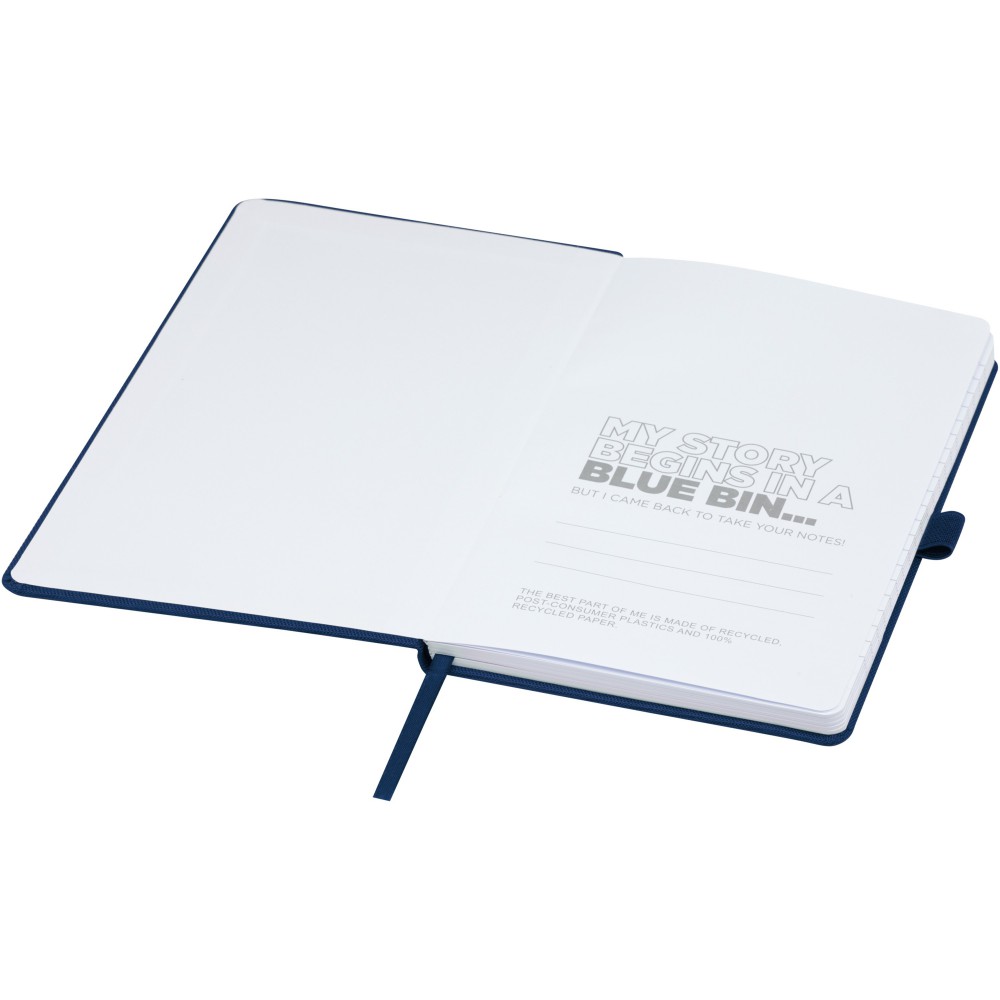 A5 jegyzetfüzet újrahasznosított PET műanyagból készült szövet borítóval. 80 lap 70 g/m2 újrahasznosított, vonalas papír, tolltartó hurok és szalag könyvjelző. Kombinálható a 107757 Honua RPET golyóstollal. Emblémázás: Szitanyomás