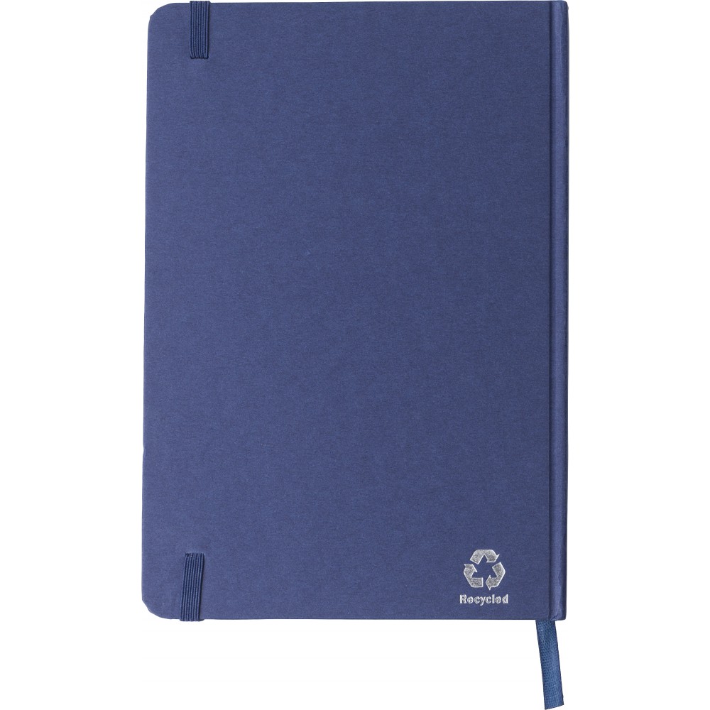 Újrahasznosított kartonból készült A5-ös jegyzetfüzet 80 vonalas lappal. Gumis záródás és könyvjelző szalag. Emblémázás: Tamponnyomás, UV nyomtatás