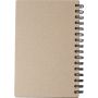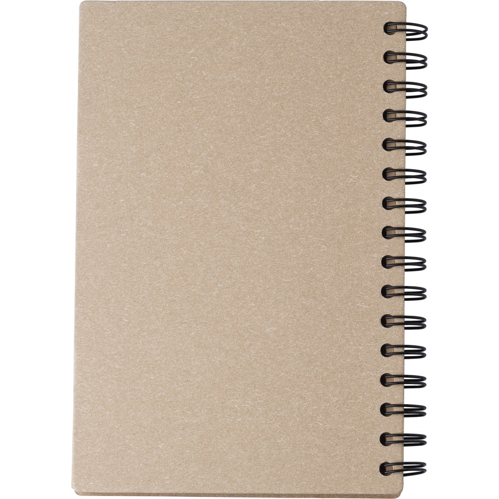 Újrahasznosított kartonból készült, keményfedeles spirálfüzet 80 vonalas, újrahasznosított barna papírlappal. Lapok minősége: 65 g/m2. Az újrahasznosított alapanyagra utaló logó minden lapon látható. Emblémázás: Tamponnyomás