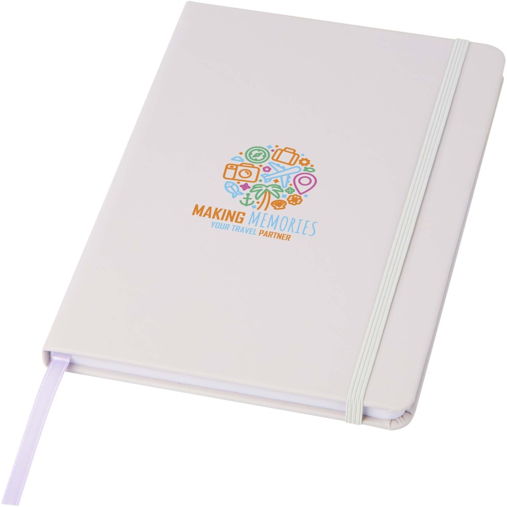 Spectrum A5 jegyzetfüzet színes fedéllel, jelölőszalaggal és gumipánttal, 96 vonalas lappal (60g/m2). Emblémázás: Szitanyomás, Tamponnyomás, UV nyomtatás