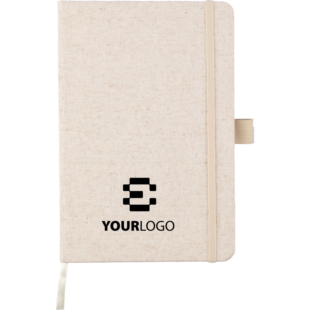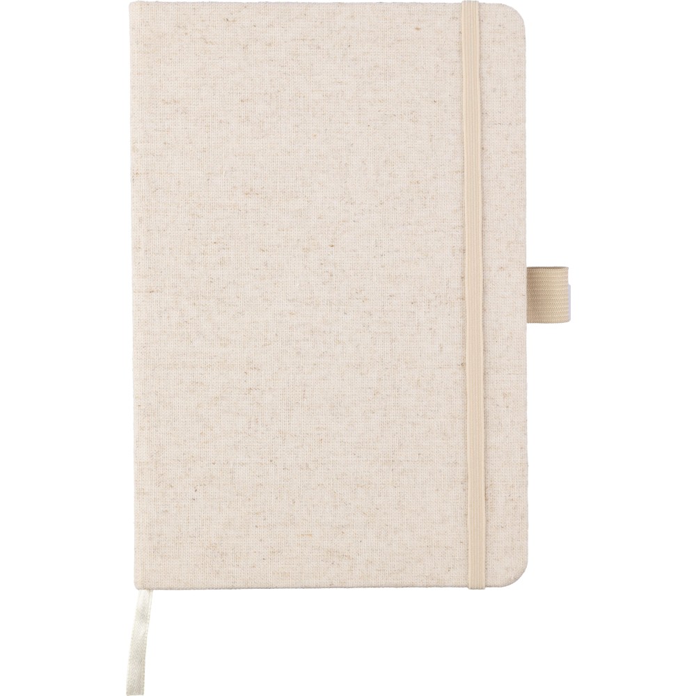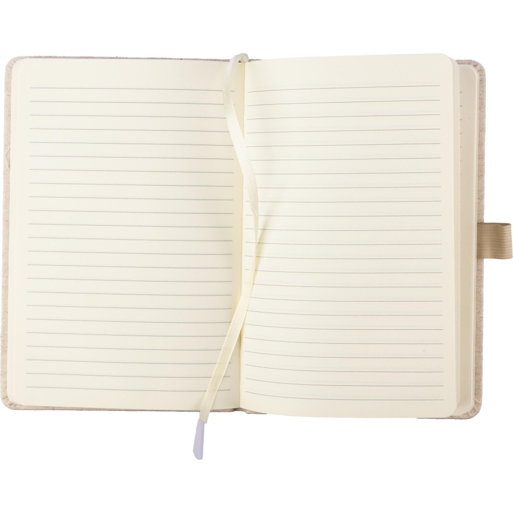 Kenderből készült jegyzetfüzet (kb. A5-ös méret) 80 lappal, tollhurokkal, gumis záródással és hozzáillő natúr színű könyvjelzővel. A borító hátoldalán kender alapanyagot jelző logó. Emblémázás: Szitanyomás