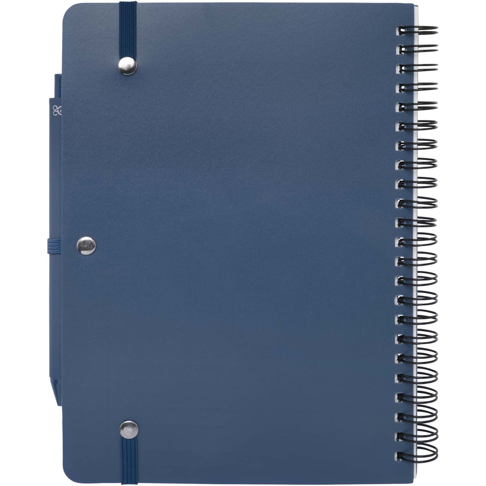 Thalaasa A5 keményfedeles jegyzetfüzet óceánból származó újrahasznosított műanyagból készült, és 80 vonalas, 70 g/m2 krémszínű lapot tartalmaz. A jegyzetfüzet lekerekített sarkokkal, elasztikus zárással és tolltartóval rendelkezik. A fekete tintával író golyóstoll szintén óceánból származó újrahasznosított műanyagból készült. Íráshossz: 1000 méter. Tollhegy mérete: 1,0 mm. Emblémázás: Tamponnyomás
