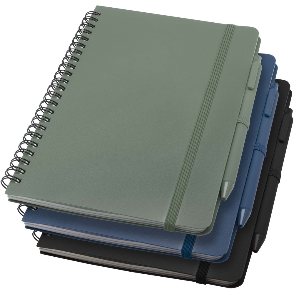 Thalaasa A5 keményfedeles jegyzetfüzet óceánból származó újrahasznosított műanyagból készült, és 80 vonalas, 70 g/m2 krémszínű lapot tartalmaz. A jegyzetfüzet lekerekített sarkokkal, elasztikus zárással és tolltartóval rendelkezik. A fekete tintával író golyóstoll szintén óceánból származó újrahasznosított műanyagból készült. Íráshossz: 1000 méter. Tollhegy mérete: 1,0 mm. Emblémázás: Tamponnyomás